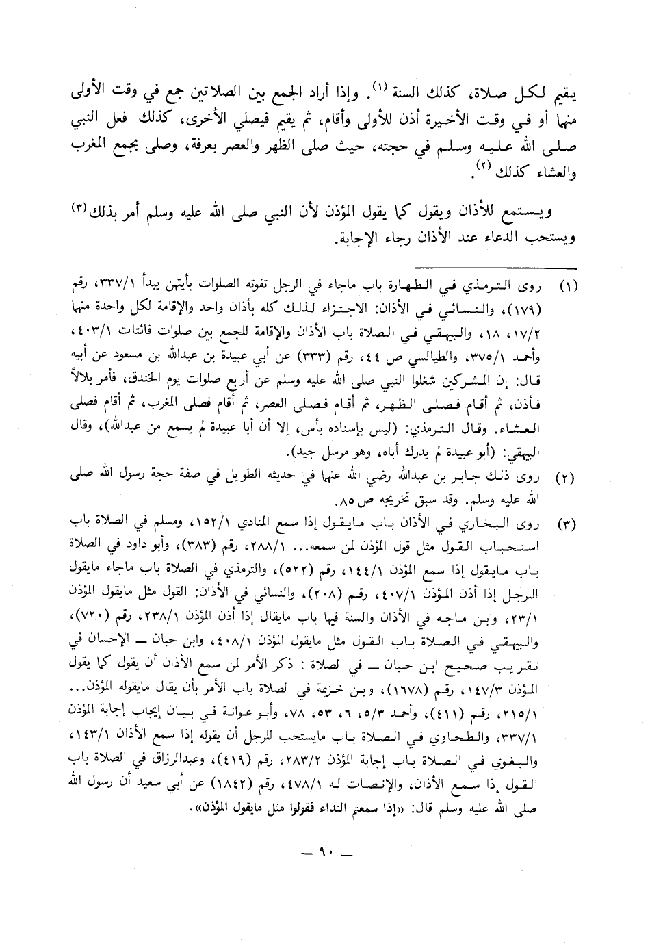 يقيم لكل صلاة كذلك السنة، وإذا أراد الجمع بين الصلاتين جمع في وقت الأولى منهما، أو في وقت الآخرة، أذن للأولى وأقام فصلاها، ثم يقيم فيصلي الأخرى، كذلك فعل النَّبِيّ صَلَّى اللَّهُ عَلَيْهِ وَسَلَّمَ في حجته حين صلى الظهر والعصر بعرفة، وصلى بجمع المغرب والعشاء، كذلك ويستمع للأذان ويقول كما يقول المؤذن، لأن النَّبِيّ صَلَّى اللَّهُ عَلَيْهِ وَسَلَّمَ أمر بذلك، ويستحب الدعاء عند الأذان رجاء الإجابة،