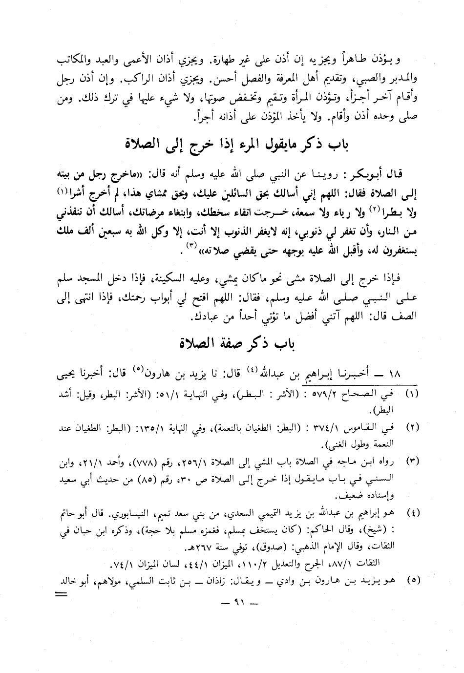 فإذا خرج إِلَى الصلاة مشى نحو مَا كَانَ يمشي وعليه السكينة، فإذا دخل المسجد سلم عَلَى النَّبِيّ صَلَّى اللَّهُ عَلَيْهِ وَسَلَّمَ، فَقَالَ: «اللهم افتح لي أبواب رحمتك» ، فإذا أتى إِلَى الصف، قَالَ: اللهم آتني أفضل مَا تؤتي أحدًا من عبادك.