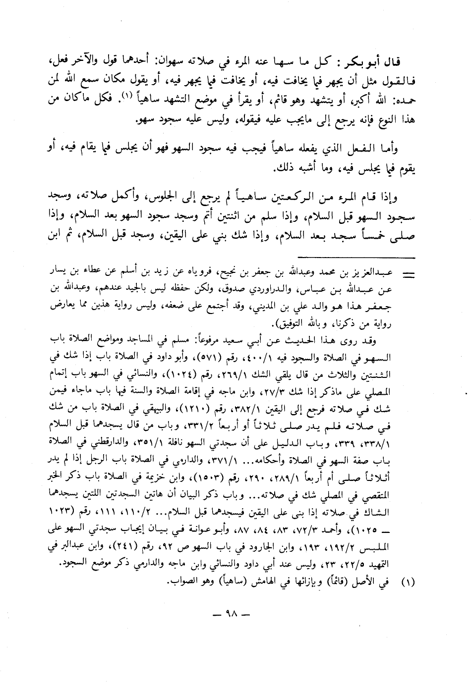 وأما الفعل الذي يفعله ساهيًا فيجب فِيهِ سجود السهو، فهو أن يجلس فيما يقام فِيهِ، أو يقوم فيما يجلس فِيهِ وما أشبه ذَلِكَ، وإذا قام المرء من الركعتين ساهيًا لم يرجع إِلَى الجلوس وأكمل صلاته وسجد سجود السهو قبل السلام، وإذا سلم من اثنتين أتم وسجد سجود السهو بعد السلام، وإذا صلى خمسًا سجد بعد السلام، وإذا شك بنى عَلَى اليقين، وسجد قبل السلام، ثم ابن