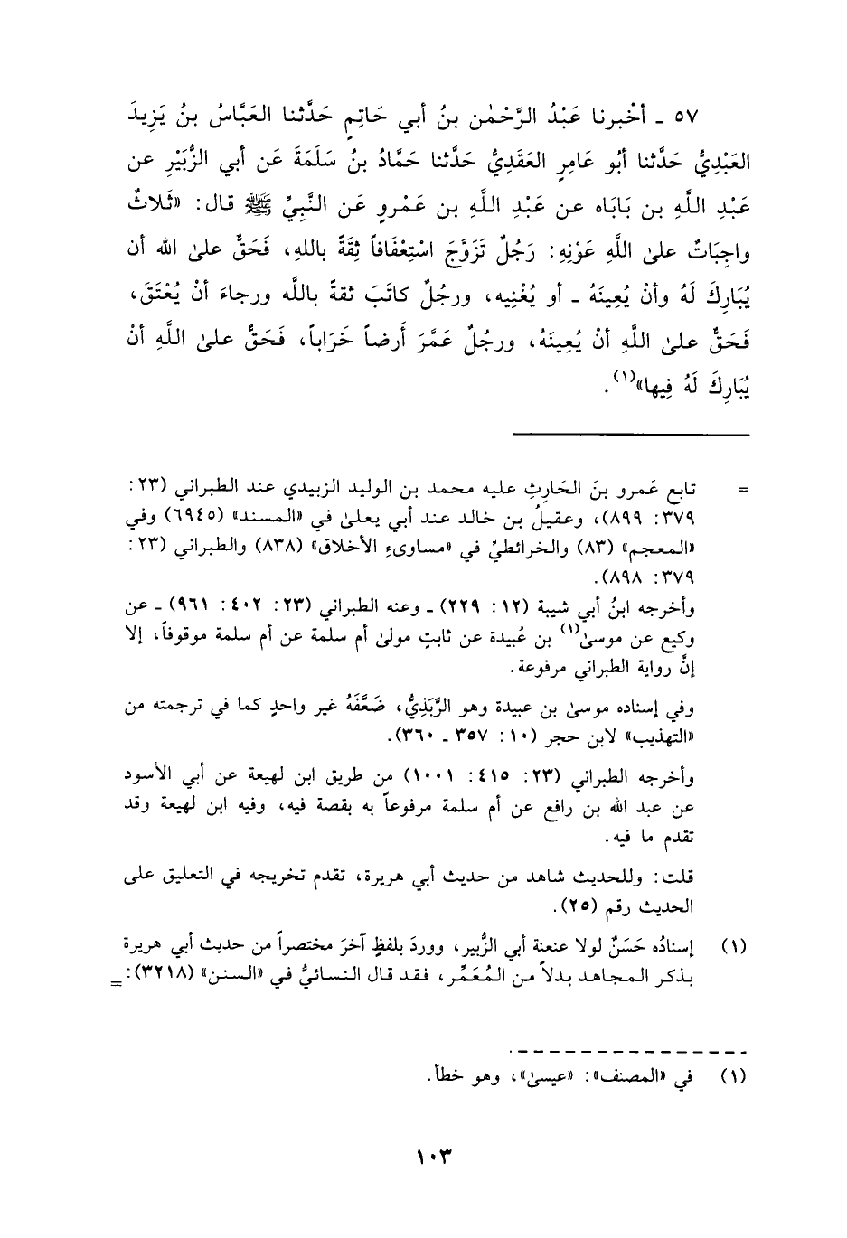 57 - أَخْبَرَنَا عَبْدُ الرَّحْمَنِ بْنُ أَبِي حَاتِمٍ، حَدَّثَنَا الْعَبَّاسُ بْنُ يَزِيدَ الْعَبْدِيُّ، حَدَّثَنَا أَبُو عَامِرٍ الْعَقَدِيُّ، حَدَّثَنَا حَمَّادُ بْنُ سَلَمَةَ، عَنْ أَبِي الزُّبَيْرِ، عَنْ عَبْدِ اللَّهِ بْنِ بَابَاهْ، عَنْ عَبْدِ اللَّهِ بْنِ عَمْرٍو، عَنِ النَّبِيِّ صَلَّى اللهُ عَلَيْهِ وَسَلَّمَ قَالَ: §«ثَلَاثٌ وَاجِبَاتٌ عَلَى اللَّهِ عَوْنُهُ رَجُلٌ تَزَوَّجَ اسْتِعْفَافًا ثِقَةً بِاللَّهِ فَحَقٌّ عَلَى اللَّهِ أَنْ يُبَارِكَ لَهُ وَأَنْ يُعِينَهُ أَوْ يُغْنِيَهُ , وَرَجُلٌ كَاتَبَ ثِقَةً بِاللَّهِ وَرَجَاءً أَنْ يُعْتِقَ فَحَقٌّ عَلَى اللَّهِ أَنْ يُعِينَهُ , وَرَجُلٌ عَمَّرَ أَرْضًا خَرَابًا فَحَقٌّ عَلَى اللَّهِ أَنْ يُبَارِكَ لَهُ فِيهَا»