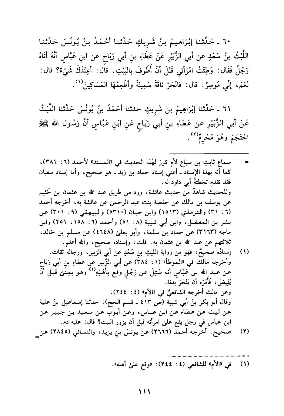 60 - حَدَّثَنَا إِبْرَاهِيمُ بْنُ شَرِيكٍ، حَدَّثَنَا أَحْمَدُ بْنُ يُونُسَ، حَدَّثَنَا اللَّيْثُ بْنُ سَعْدٍ، عَنْ أَبِي الزُّبَيْرِ، عَنْ عَطَاءِ بْنِ أَبِي رَبَاحٍ، عَنِ ابْنِ عَبَّاسٍ، أَنَّهُ أَتَاهُ رَجُلٌ فَقَالَ: " §وَطِئْتُ امْرَأَتِي قَبْلَ أَنْ أَطُوفَ بِالْبَيْتِ قَالَ: أَعِنْدَكَ شَيْءٌ؟ قَالَ: نَعَمْ إِنِّي مُوسِرٌ. قَالَ: فَانْحَرْ نَاقَةً سَمِينَةً وَأَطْعِمْهَا الْمَسَاكِينَ "