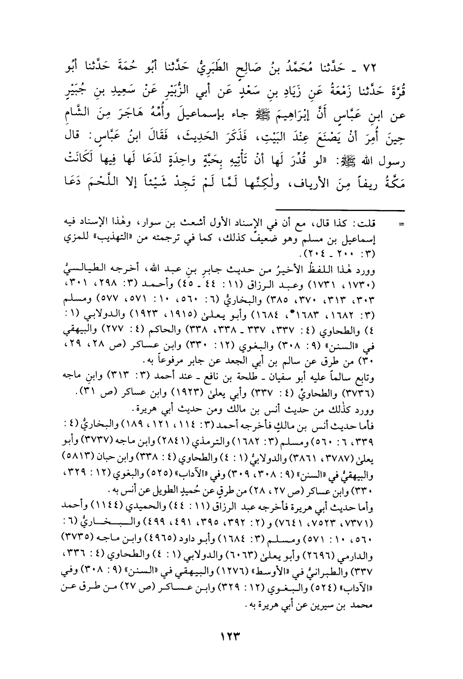 حَدَّثَنَا مُحَمَّدُ بْنُ صَالِحٍ الطَّبَرِيُّ، حَدَّثَنَا أَبُو حُمَةَ، حَدَّثَنَا أَبُو قُرَّةَ، حَدَّثَنَا زَمْعَةُ، عَنْ زِيَادِ بْنِ سَعْدٍ، عَنْ أَبِي الزُّبَيْرِ، عَنْ سَعِيدِ بْنِ جُبَيْرِ، عَنِ ابْنِ عَبَّاسٍ، أَنَّ إِبْرَاهِيمَ صَلَّى اللهُ عَلَيْهِ وَسَلَّمَ، جَاءَ بِإِسْمَاعِيلَ، وَأُمِّهِ هَاجَرَ، مِنَ الشَّامِ حِينَ أُمِرَ أَنْ يَصْنَعَ عِنْدَ الْبَيْتِ فَذَكَرَ الْحَدِيثَ فَقَالَ ابْنُ عَبَّاسٍ: قَالَ رَسُولُ اللَّهِ صَلَّى اللهُ عَلَيْهِ وَسَلَّمَ: §«لَوْ قُدِّرَ لَهَا أَنْ تَأْتِيَهُ بِحَبَّةٍ وَاحِدَةٍ لَدَعَا لَهَا فِيهَا لَكَانَتْ مَكَّةُ رِيفًا مِنَ الْأَرْيَافِ وَلَكِنَّهَا لَمَّا لَمْ تَجِدْ شَيْئًا إِلَّا اللَّحْمَ دَعَا -[124]- لَهُمْ أَنْ يُبَارِكَ اللَّهُ لَهُمْ فِي لَحْمِهِمْ وَلَبَنِهِمْ وَمَائِهِمْ»