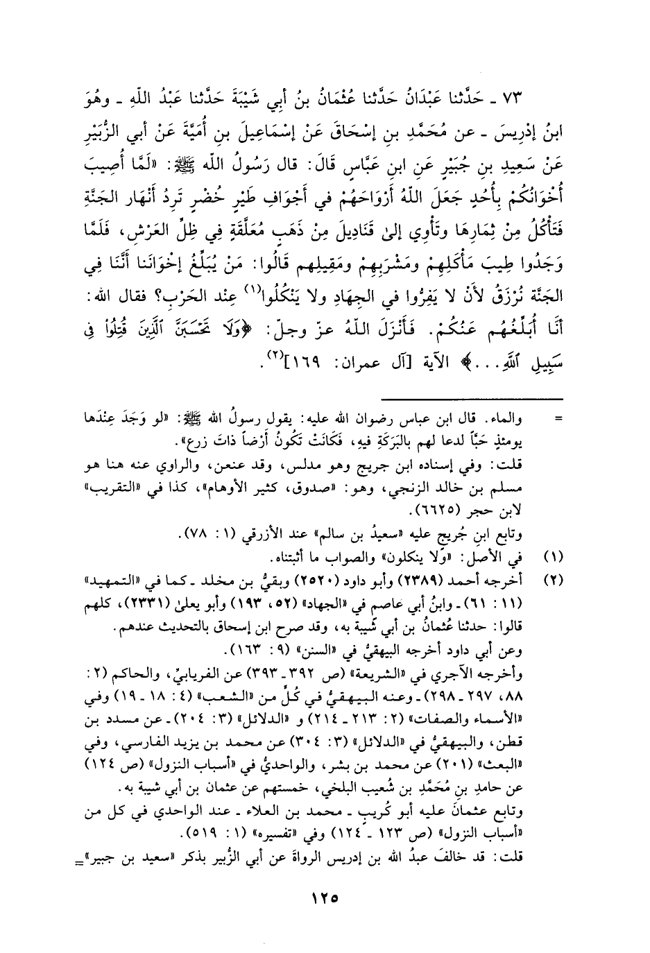 73 - حَدَّثَنَا عَبْدَانُ، حَدَّثَنَا عُثْمَانُ بْنُ أَبِي شَيْبَةَ، حَدَّثَنَا عَبْدُ اللَّهِ وَهُوَ ابْنُ إِدْرِيسَ عَنْ مُحَمَّدِ بْنِ إِسْحَاقَ، عَنْ إِسْمَاعِيلَ بْنِ أُمَيَّةَ، عَنْ أَبِي الزُّبَيْرِ، عَنْ سَعِيدِ بْنِ جُبَيْرٍ، عَنِ ابْنِ عَبَّاسٍ، قَالَ: قَالَ رَسُولُ اللَّهِ صَلَّى اللهُ عَلَيْهِ وَسَلَّمَ: §" لَمَّا أُصِيبَ إِخْوَانُكُمْ بِأُحُدٍ جَعَلَ اللَّهُ أَرْوَاحَهُمْ فِي أَجْوَافِ طَيْرٍ خُضْرٍ تَرِدُ أَنْهَارَ الْجَنَّةِ فَتَأْكُلُ مِنْ ثِمَارِهَا وَتَأْوِي إِلَى قَنَادِيلَ مِنْ ذَهَبٍ مُعَلَّقَةٍ فِي ظِلِّ الْعَرْشِ فَلَمَّا وَجَدُوا طِيبَ مَأْكَلِهِمْ وَمَشْرَبِهِمْ وَمَقِيلِهِمْ قَالُوا: مَنْ يُبَلِّغُ إِخْوَانَنَا أَنَّنَا فِي الْجَنَّةِ نُرْزَقُ؛ لِأَنْ لَا يَفِرُّوا فِي الْجِهَادِ وَلَا يَنْكُلُوا عِنْدَ الْحَرْبِ فَقَالَ اللَّهُ: أَنَا أُبَلِّغَهُمُ عَنْكُمْ فَأَنْزَلَ اللَّهُ عَزَّ وَجَلَّ {وَلَا تَحْسَبَنَّ الَّذِينَ قُتِلُوا فِي سَبِيلِ اللَّهِ} [آل عمران: 169] " الْآَيَةَ