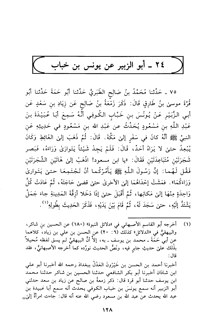 75 - حَدَّثَنَا مُحَمَّدُ بْنُ صَالِحٍ الطَّبَرِيُّ، حَدَّثَنَا أَبُو حُمَةَ، حَدَّثَنَا أَبُو قُرَّةَ مُوسَى بْنُ طَارِقٍ، قَالَ: ذَكَرَ زَمْعَةُ بْنُ صَالِحٍ، عَنْ زِيَادِ بْنِ سَعْدٍ، عَنْ أَبِي الزُّبَيْرِ، عَنْ يُونُسَ بْنِ خَبَّابٍ الْكُوفِيِّ، أَنَّهُ سَمِعَ أَبَا عُبَيْدَةَ بْنَ عَبْدِ اللَّهِ بْنِ مَسْعُودٍ، يُحَدِّثُ عَنْ عَبْدِ اللَّهِ بْنِ مَسْعُودٍ، فِي حَدِيثِهِ عَنِ النَّبِيِّ صَلَّى اللهُ عَلَيْهِ وَسَلَّمَ: " أَنَّهُ كَانَ فِي سَفَرٍ إِلَى مَكَّةَ قَالَ: ثُمَّ §ذَهَبَ إِلَى الْغَائِطِ وَكَانَ يُبْعِدُ حَتَّى لَا يَرَاهُ أَحَدٌ قَالَ فَلَمْ يَجِدْ شَيْئًا يَتَوَارَى وَرَاءَهُ فَبَصَرَ شَجَرَتَيْنِ مُتَبَاعِدَتَيْنِ فَقَالَ: «يَا ابْنَ مَسْعُودٍ اذْهَبْ إِلَى هَاتَيْنِ الشَّجَرَتَيْنِ فَقُلْ لَهُمَا إِنَّ رَسُولَ اللَّهِ صَلَّى اللهُ عَلَيْهِ وَسَلَّمَ يَأْمُرُكُمَا أَنْ تَجْتَمِعَا حَتَّى يَتَوَارَى وَرَاءَكُمَا فَمَشَتْ إِحْدَاهُمَا إِلَى الْأُخْرَى حَتَّى قَضَى حَاجَتَهُ ثُمَّ عَادَتْ كُلُّ وَاحِدَةٍ مِنْهَا إِلَى مَكَانِهَا ثُمَّ أَقْبَلَ حَتَّى إِذَا دَخَلَا أَزِقَّةَ الْمَدِينَةِ جَاءَ جَمَلٌ يَشْتَدُّ إِلَيْهِ حَتَّى سَجَدَ لَهُ ثُمَّ قَامَ بَيْنَ يَدَيْهِ» فَذَكَرَ الْحَدِيثَ بِطُولِهِ