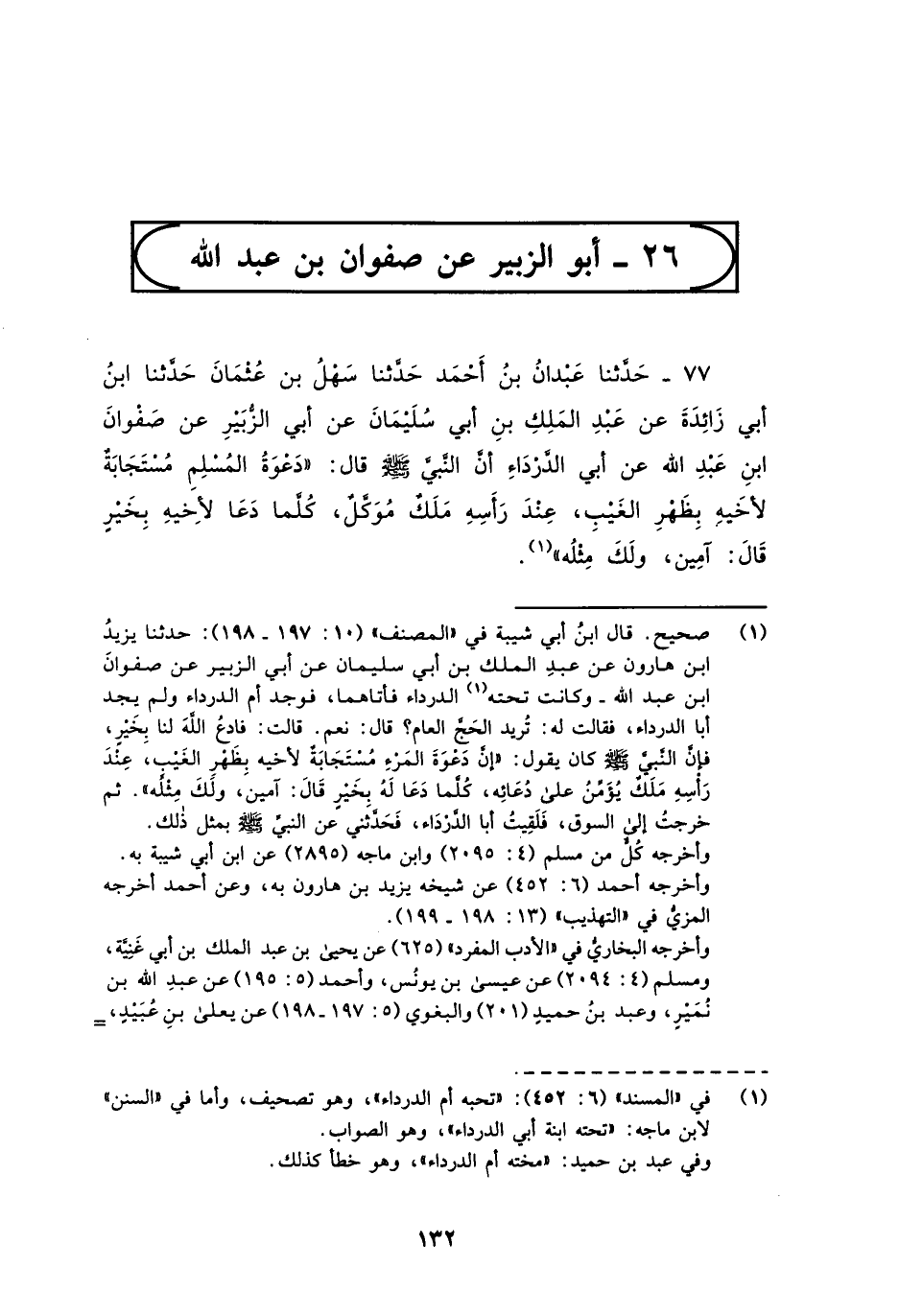 77 - حَدَّثَنَا عَبْدَانُ بْنُ أَحْمَدَ، حَدَّثَنَا سَهْلُ بْنُ عُثْمَانَ، حَدَّثَنَا ابْنُ أَبَى زَائِدَةَ عَنْ عَبْدِ الْمَلِكِ بْنِ أَبِي سُلَيْمَانَ، عَنْ أَبِي الزُّبَيْرِ، عَنْ صَفْوَانَ بْنِ عَبْدِ اللَّهِ، عَنْ أَبِي الدَّرْدَاءِ أَنَّ النَّبِيَّ صَلَّى اللهُ عَلَيْهِ وَسَلَّمَ قَالَ: §" دَعْوَةُ الْمُسْلِمِ مُسْتَجَابَةٌ لِأَخِيهِ بِظَهْرِ الْغَيْبِ عِنْدَ رَأْسِهِ مَلَكٌ مُوَكَّلٌ كُلَّمَا دَعَا لِأَخِيهِ بِخَيْرٍ قَالَ: آمِينَ وَلَكَ مِثْلُهُ "