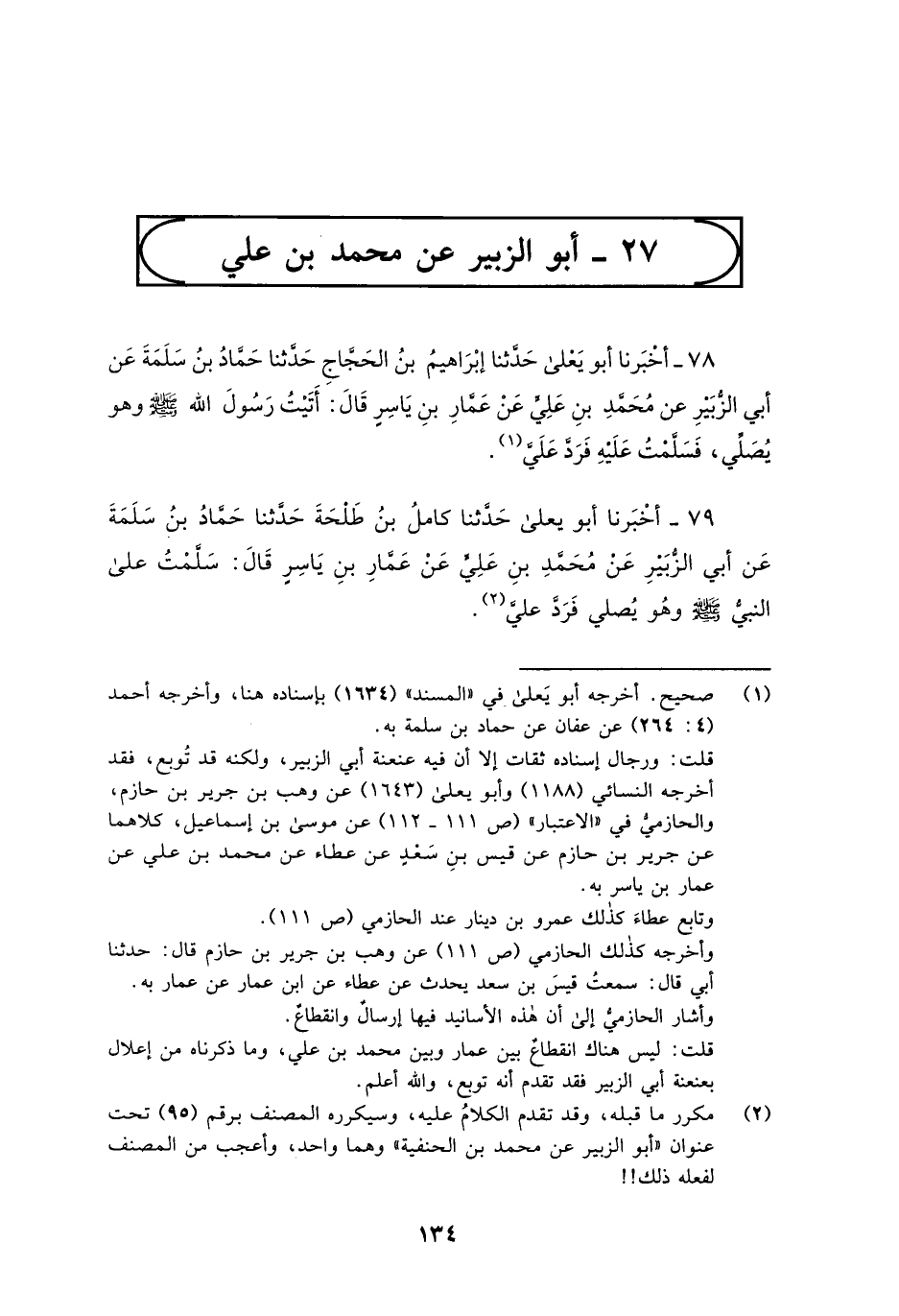 79 - أَخْبَرَنَا أَبُو يَعْلَى، حَدَّثَنَا كَامِلُ بْنُ طَلْحَةَ، حَدَّثَنَا حَمَّادُ بْنُ سَلَمَةَ، عَنْ أَبِي الزُّبَيْرِ، عَنْ مُحَمَّدِ بْنِ عَلِيٍّ، عَنْ عَمَّارِ بْنِ يَاسِرٍ قَالَ: §«سَلَّمْتُ عَلَى النَّبِيِّ صَلَّى اللهُ عَلَيْهِ وَسَلَّمَ وَهُوَ يُصَلِّي فَرَدَّ عَلَيَّ»