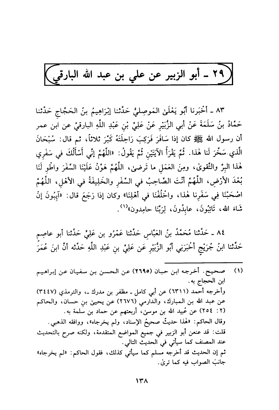83 - أَخْبَرَنَا أَبُو يَعْلَى الْمَوْصِلِيُّ، حَدَّثَنَا إِبْرَاهِيمُ بْنُ الْحَجَّاجِ، حَدَّثَنَا حَمَّادُ بْنُ سَلَمَةَ، عَنْ أَبِي الزُّبَيْرِ، عَنْ عَلِيِّ بْنِ عَبْدِ اللَّهِ الْبَارِقِيِّ، عَنِ ابْنِ عُمَرَ " أَنَّ رَسُولَ اللَّهِ صَلَّى اللهُ عَلَيْهِ وَسَلَّمَ كَانَ إِذَا سَافَرَ فَرَكِبَ رَاحِلَتَهُ كَبَّرَ ثَلَاثًا ثُمَّ قَالَ: " {سُبْحَانَ الَّذِي سَخَّرَ لَنَا هَذَا} [الزخرف: 13] ثُمَّ يَقْرَأُ الْآيَتَيْنِ " ثُمَّ يَقُولُ: §«اللَّهُمَّ إِنِّي أَسْأَلُكَ فِي سَفَرِي هَذَا الْبِرَّ وَالتَّقْوَى وَمِنَ الْعَمَلِ مَا تَرْضَى اللَّهُمَّ هَوِّنْ عَلَيْنَا السَّفَرَ وَاطْوِ لَنَا بُعْدَ الْأَرْضِ , اللَّهُمَّ أَنْتَ الصَّاحِبُ فِي السَّفَرِ وَالْخَلِيفَةُ فِي الْأَهْلِ اللَّهُمَّ اصْحَبْنَا فِي سَفَرِنَا هَذَا , وَاخْلُفْنَا فِي أَهْلِنَا» وَكَانَ إِذَا رَجَعَ قَالَ: «آيِبُونَ إِنْ شَاءَ اللَّهُ تَائِبُونَ عَابِدُونَ لِرَبِّنَا حَامِدُونَ»