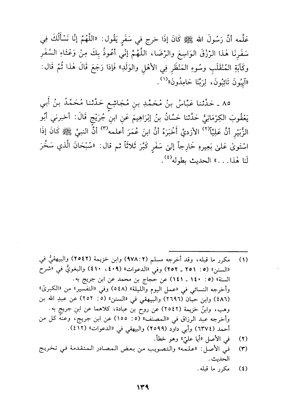 85 - حَدَّثَنَا عَبَّاسُ بْنُ مُحَمَّدِ بْنِ مُجَاشِعٍ، حَدَّثَنَا مُحَمَّدُ بْنُ أَبِي يَعْقُوبَ الْكَرْمَانِيُّ، حَدَّثَنَا حَسَّانُ بْنُ إِبْرَاهِيمَ، عَنِ ابْنِ جُرَيْجٍ، قَالَ: أَخْبَرَنِي أَبُو الزُّبَيْرِ، أَنَّ عَلِيًّا الْأَزْدِيَّ، أَخْبَرَهُ، أَنَّ ابْنَ عُمَرَ أَعْلَمَهُ أَنَّ النَّبِيَّ صَلَّى اللهُ عَلَيْهِ وَسَلَّمَ " كَانَ §إِذَا اسْتَوَى عَلَى بَعِيرِهِ خَارِجًا إِلَى سَفَرٍ كَبَّرَ ثَلَاثًا ثُمَّ قَالَ: " {سُبْحَانَ الَّذِي سَخَّرَ لَنَا هَذَا} [الزخرف: 13] " الْحَدِيثَ بِطُولِهِ