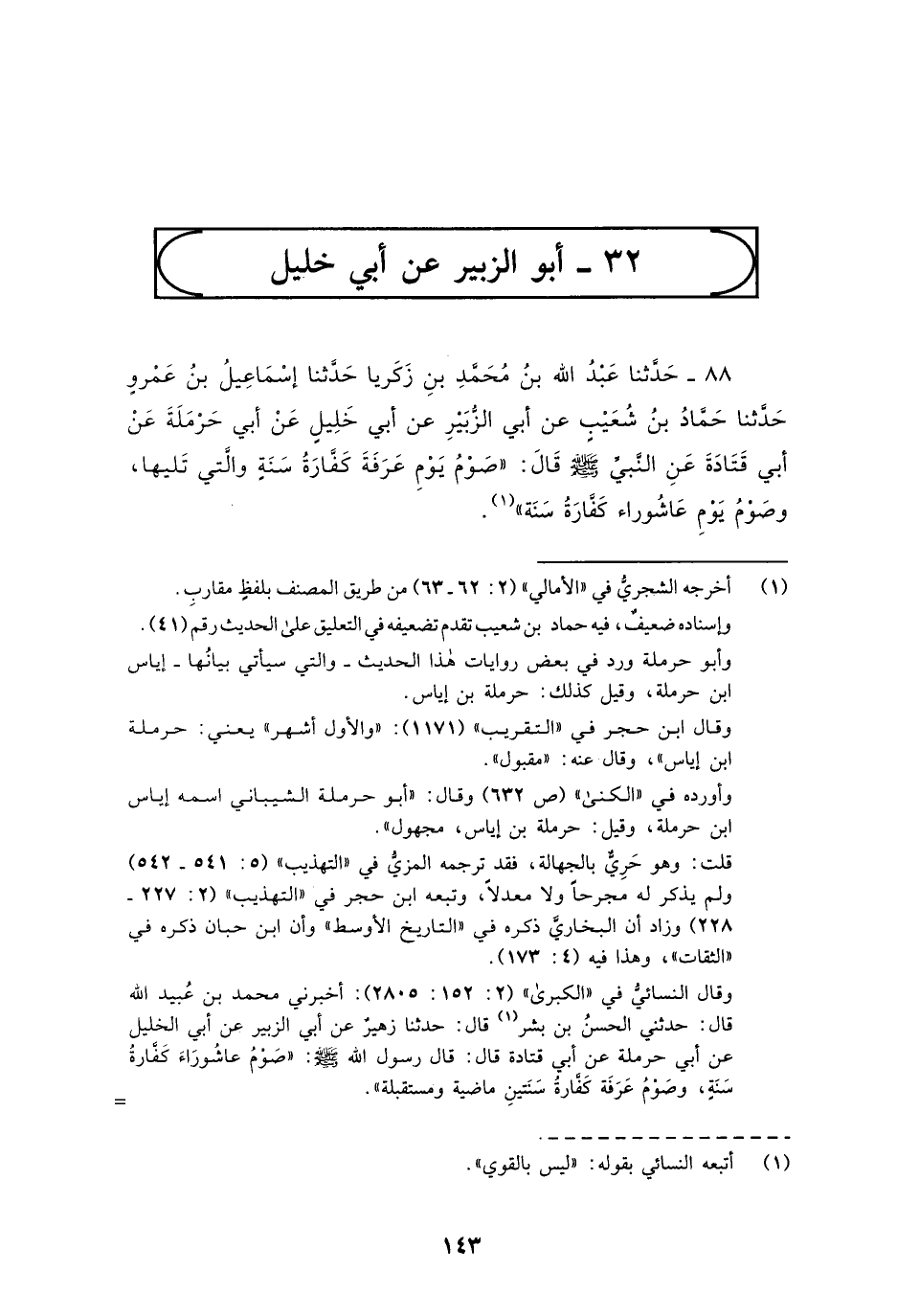 88 - حَدَّثَنَا عَبْدُ اللَّهِ بْنُ مُحَمَّدِ بْنِ زَكَرِيَّا، حَدَّثَنَا إِسْمَاعِيلُ بْنُ عَمْرٍو، حَدَّثَنَا حَمَّادُ بْنُ شُعَيْبٍ، عَنْ أَبِي الزُّبَيْرِ، عَنْ أَبِي خَلِيلٍ، عَنْ أَبِي حَرْمَلَةَ، عَنْ أَبِي قَتَادَةَ، عَنِ النَّبِيِّ صَلَّى اللهُ عَلَيْهِ وَسَلَّمَ قَالَ: «§صَوْمُ يَوْمِ عَرَفَةَ كَفَّارَةُ سَنَةٍ وَالَّتِي تَلِيهَا، وَصَوْمُ يَوْمِ عَاشُورَاءَ كَفَّارَةُ سَنَةٍ»
