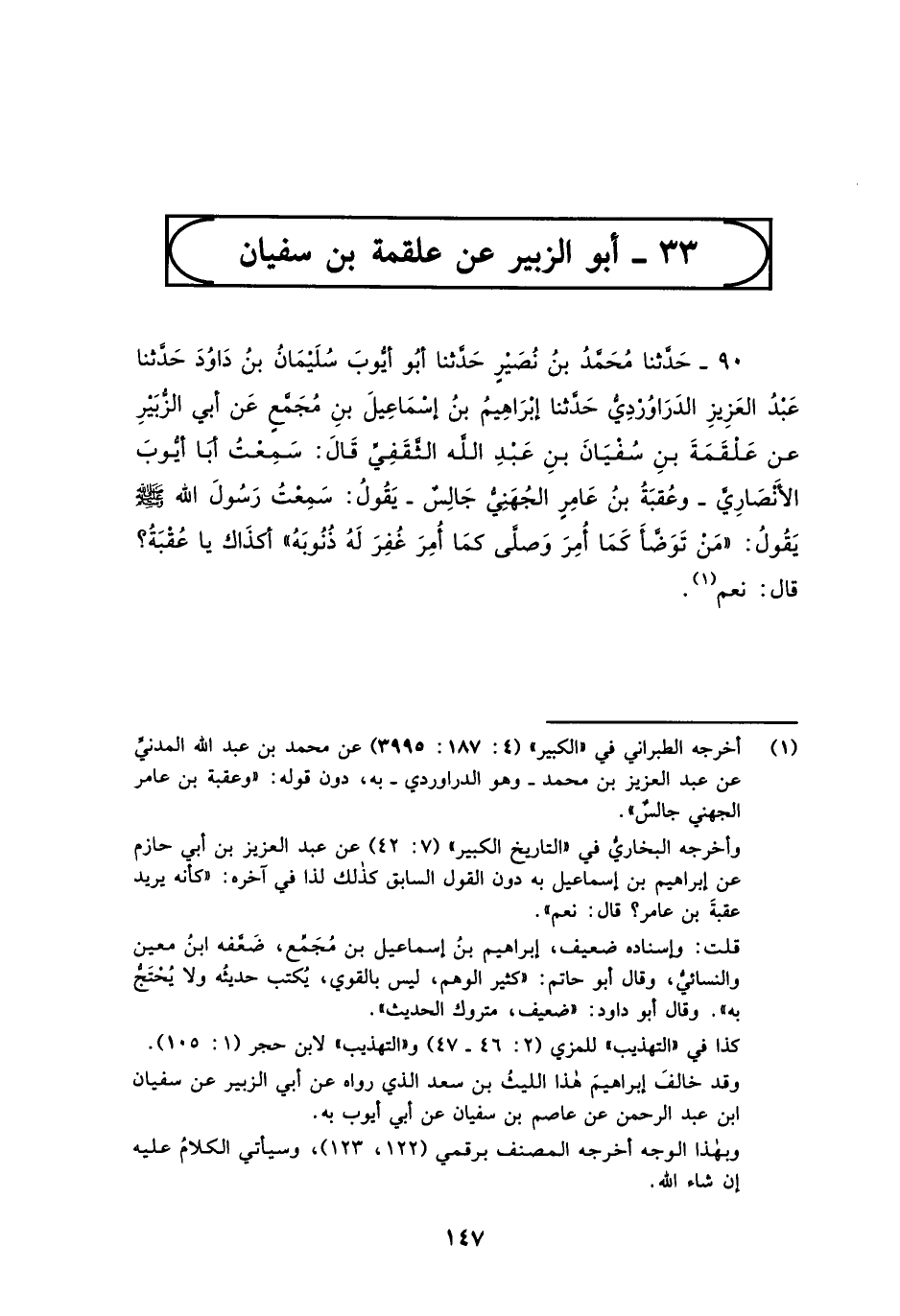 90 - حَدَّثَنَا مُحَمَّدُ بْنُ نُصَيْرٍ، حَدَّثَنَا أَبُو أَيُّوبَ سُلَيْمَانُ بْنُ دَاوُدَ , حَدَّثَنَا عَبْدُ الْعَزِيزِ الدَّرَاوَرْدِيُّ، حَدَّثَنَا إِبْرَاهِيمُ بْنُ إِسْمَاعِيلَ بْنِ مُجَمِّعٍ، عَنْ أَبِي الزُّبَيْرِ، عَنْ عَلْقَمَةَ بْنِ سُفْيَانَ بْنِ عَبْدِ اللَّهِ الثَّقَفِيِّ، قَالَ سَمِعْتُ أَبَا أَيُّوبَ الْأَنْصَارِيَّ، وَعُقْبَةُ بْنُ عَامِرٍ الْجُهَنِيَّ جَالِسٌ يَقُولُ: سَمِعْتُ رَسُولَ اللَّهِ صَلَّى اللهُ عَلَيْهِ وَسَلَّمَ يَقُولُ: §«مَنْ تَوَضَّأَ كَمَا أُمِرَ وَصَلَّى كَمَا أُمِرَ غُفِرَ لَهُ ذُنُوبُهُ» أَكَذَاكَ يَا عُقْبَةُ؟ قَالَ: نَعَمْ