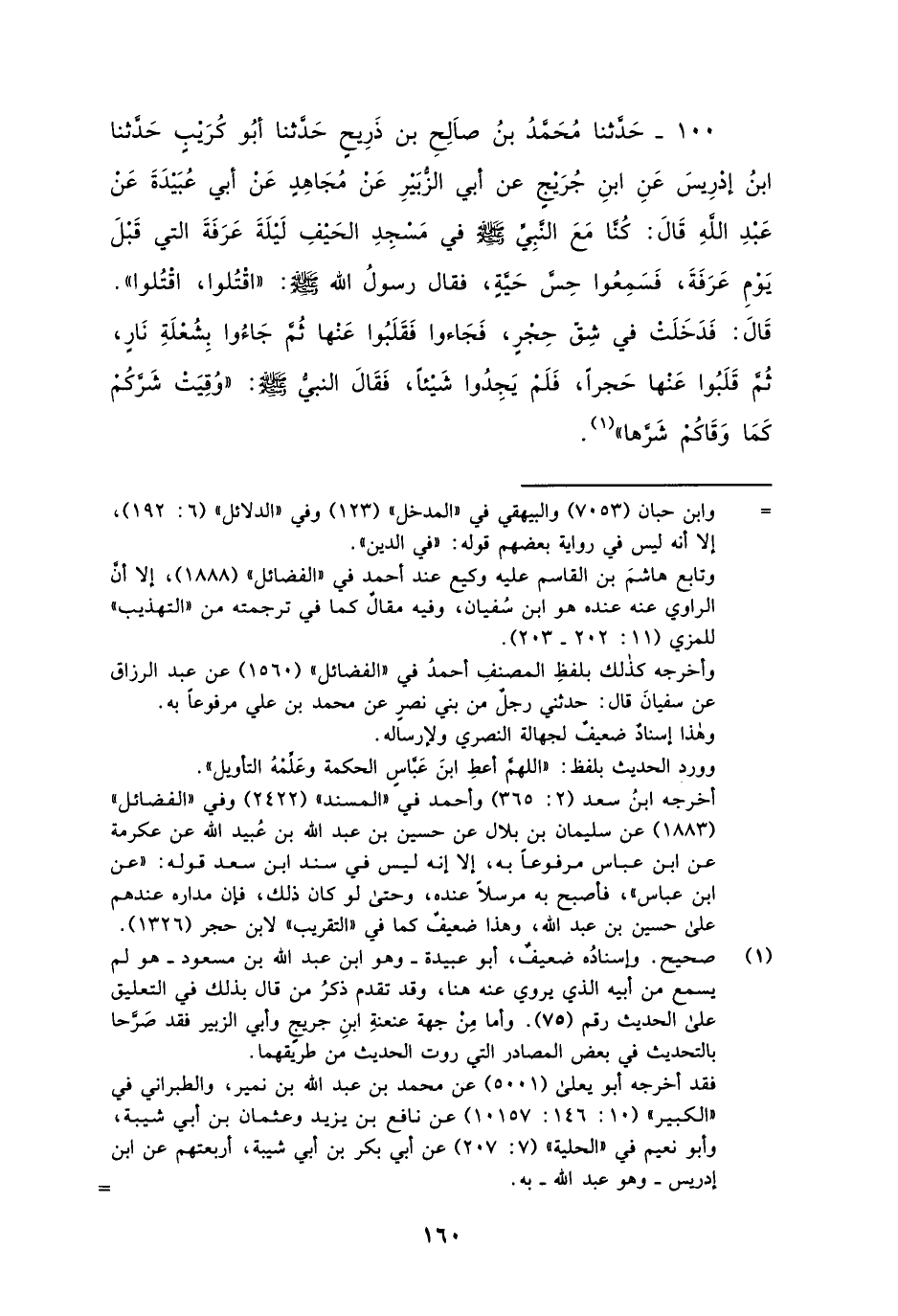 100 - حَدَّثَنَا مُحَمَّدُ بْنُ صَالِحِ بْنِ ذَرِيحٍ، حَدَّثَنَا أَبُو كُرَيْبٍ، حَدَّثَنَا ابْنُ إِدْرِيسَ، عَنِ ابْنِ جُرَيْجٍ، عَنْ أَبِي الزُّبَيْرِ، عَنْ مُجَاهِدٍ، عَنْ أَبِي عُبَيْدَةَ، عَنْ عَبْدِ اللَّهِ، قَالَ: كُنَّا مَعَ النَّبِيِّ صَلَّى اللهُ عَلَيْهِ وَسَلَّمَ فِي مَسْجِدِ الْحَيْفِ لَيْلَةَ عَرَفَةَ الَّتِي قَبْلَ يَوْمِ عَرَفَةَ §فَسَمِعُوا حِسَّ حَيَّةٍ فَقَالَ رَسُولُ اللَّهِ صَلَّى اللهُ عَلَيْهِ وَسَلَّمَ: «اقْتُلُوا اقْتُلُوا» قَالَ: فَدَخَلَتْ فِي شَقِّ حَجَرٍ فَجَاءُوا فَقَلَبُوا عَنْهَا , ثُمَّ جَاءُوا بِشُعْلَةِ نَارٍ , ثُمَّ قَلَبُوا عَنْهَا حَجَرًا فَلَمْ يَجِدُوا شَيْئًا فَقَالَ النَّبِيُّ صَلَّى اللهُ عَلَيْهِ وَسَلَّمَ: «وُقِيَتْ شَرَّكُمْ كَمَا وَقَاكُمْ شَرَّهَا»