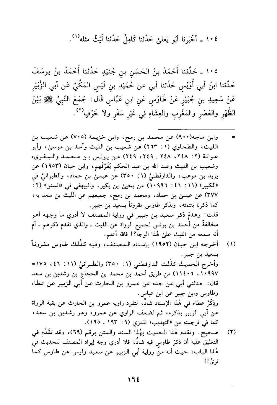 105 - حَدَّثَنَا أَحْمَدُ بْنُ الْحَسَنِ بْنِ جُنَيْدٍ، حَدَّثَنَا أَحْمَدُ بْنُ يُوسُفَ، حَدَّثَنَا ابْنُ أَبِي أُوَيْسٍ، حَدَّثَنَا أَبِي، عَنْ حُمَيْدِ بْنِ قَيْسٍ الْمَكِّيِّ، عَنْ أَبِي الزُّبَيْرِ، عَنْ سَعِيدِ بْنِ جُبَيْرٍ، عَنْ طَاوُسٍ، عَنِ ابْنِ عَبَّاسٍ، قَالَ: §«جَمَعَ النَّبِيُّ صَلَّى اللهُ عَلَيْهِ وَسَلَّمَ بَيْنَ الظُّهْرِ وَالْعَصْرِ وَالْمَغْرِبِ وَالْعِشَاءِ فِي غَيْرِ سَفَرٍ وَلَا خَوْفٍ»