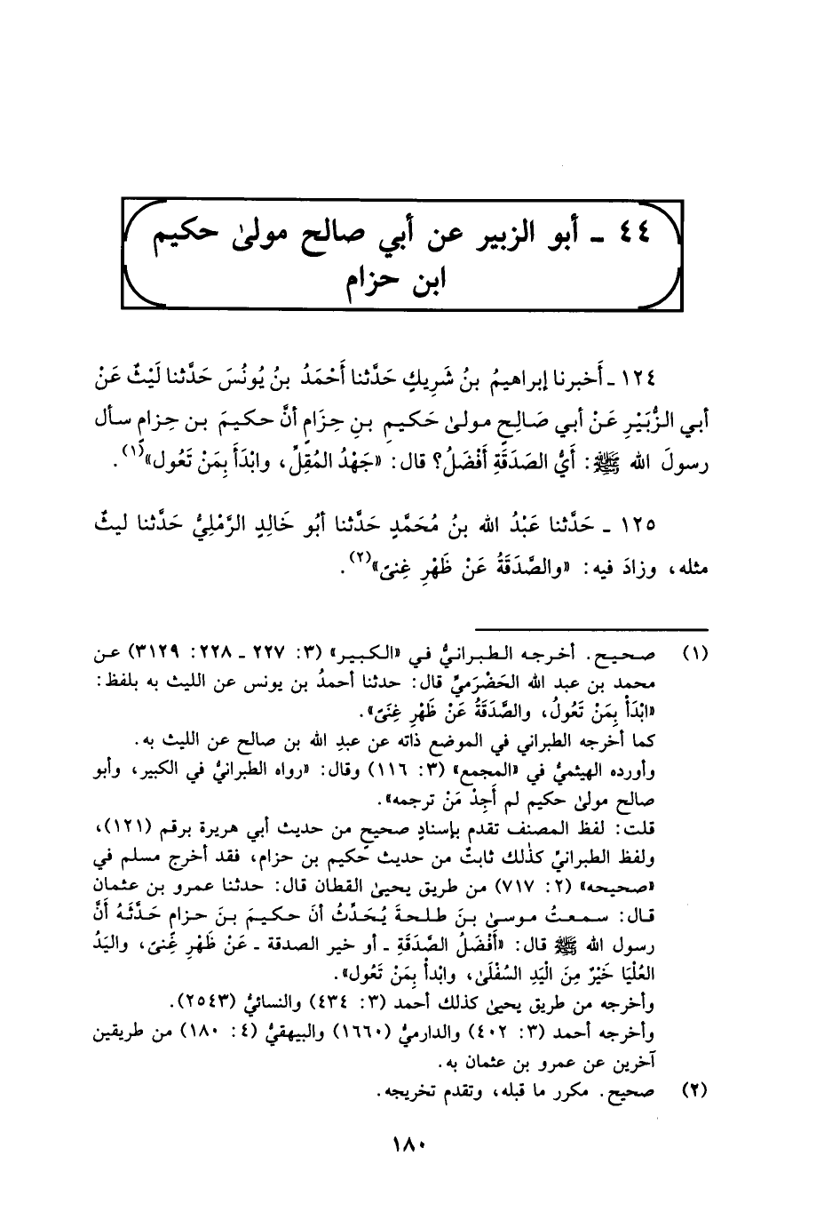 124 - أَخْبَرَنَا إِبْرَاهِيمُ بْنُ شَرِيكٍ، حَدَّثَنَا أَحْمَدُ بْنُ يُونُسَ، حَدَّثَنَا لَيْثٌ، عَنْ أَبِي الزُّبَيْرِ، عَنْ أَبِي صَالِحٍ، مَوْلَى حَكِيمِ بْنِ حِزَامٍ، أَنَّ حَكِيمَ بْنَ حِزَامٍ، «سَأَلَ رَسُولَ اللَّهِ صَلَّى اللهُ عَلَيْهِ وَسَلَّمَ» §أَيُّ الصَّدَقَةِ أَفْضَلُ؟ قَالَ: «جَهْدُ الْمُقِلِّ، وَابْدَأْ بِمَنْ تَعُولُ»