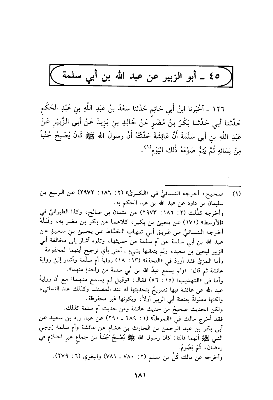 126 - أَخْبَرَنَا ابْنُ أَبِي حَاتِمٍ، حَدَّثَنَا سَعْدُ بْنُ عَبْدِ اللَّهِ بْنِ عَبْدِ الْحَكَمِ، حَدَّثَنَا أَبِي، حَدَّثَنَا بَكْرُ بْنُ مُضَرٍ، عَنْ خَالِدِ بْنِ يَزِيدَ، عَنْ أَبِي الزُّبَيْرِ، عَنْ عَبْدِ اللَّهِ بْنِ أَبِي سَلَمَةَ، أَنَّ عَائِشَةَ، حَدَّثَتْهُ «أَنَّ رَسُولَ اللَّهِ صَلَّى اللهُ عَلَيْهِ وَسَلَّمَ §كَانَ يُصْبِحُ جُنُبًا مِنْ نِسَائِهِ ثُمَّ يُتِمُّ صَوْمَهُ ذَلِكَ الْيَوْمَ»