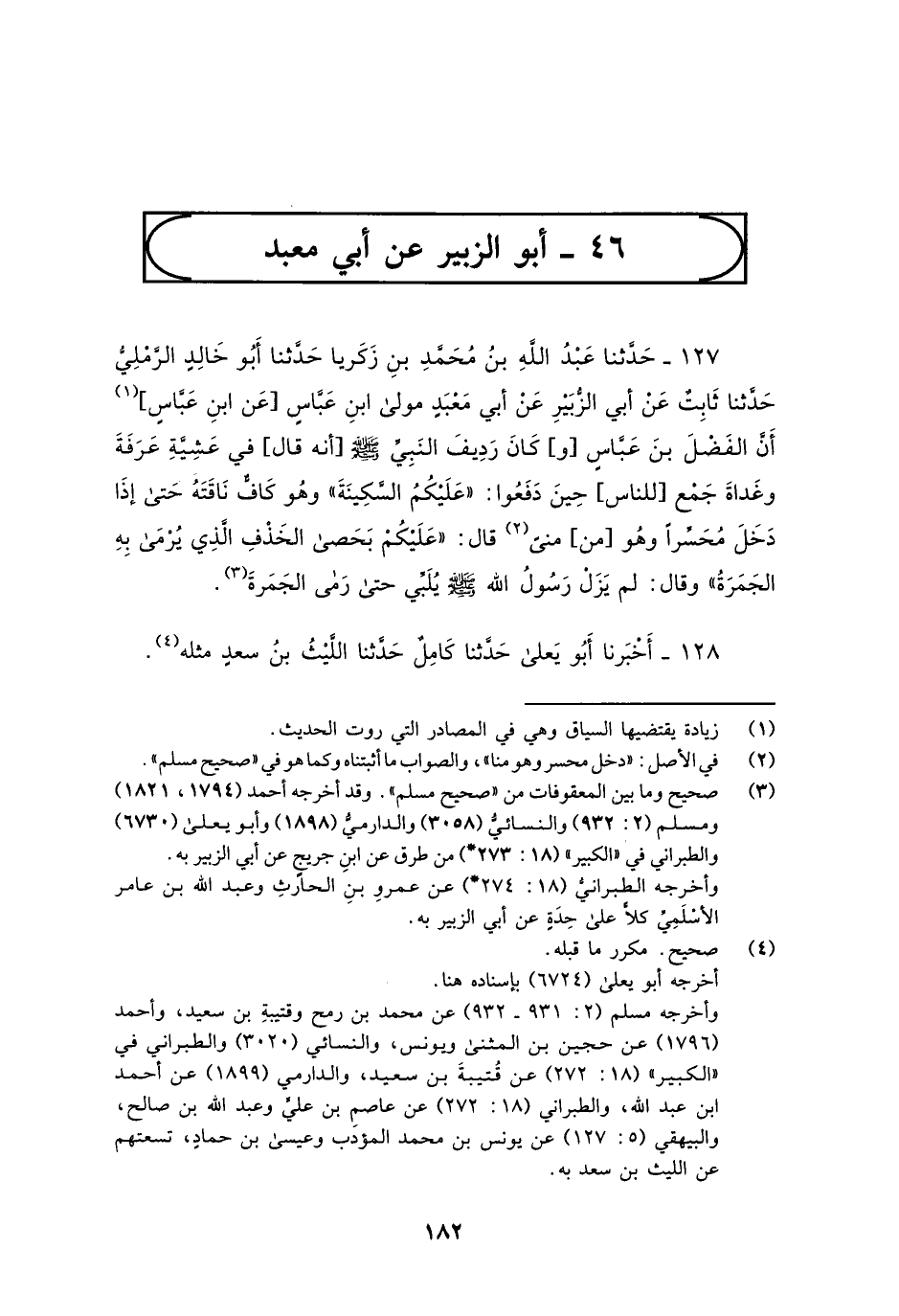 127 - حَدَّثَنَا عَبْدُ اللَّهِ بْنُ مُحَمَّدِ بْنِ زَكَرِيَّا، حَدَّثَنَا أَبُو خَالِدٍ الرَّمْلِيُّ، حَدَّثَنَا ثَابِتٌ، عَنْ أَبِي الزُّبَيْرِ، عَنْ أَبِي مَعْبَدٍ، مَوْلَى ابْنِ عَبَّاسٍ , عَنِ ابْنِ عَبَّاسٍ، أَنَّ الْفَضْلَ بْنَ عَبَّاسٍ، وَكَانَ رَدِيفَ النَّبِيِّ صَلَّى اللهُ عَلَيْهِ وَسَلَّمَ أَنَّهُ قَالَ فِي عَشِيَّةِ عَرَفَةَ، وَغَدَاةِ جَمْعٍ لِلنَّاسِ حِينَ دُفِعُوا: «عَلَيْكُمُ السَّكِينَةَ» وَهُوَ كَافٍ نَاقَتَهُ حَتَّى إِذَا دَخَلَ مُحَسِّرًا وَهُوَ مِنْ مِنًى قَالَ: «§عَلَيْكُمْ بِحَصَى الْخَذْفِ الَّذِي يُرْمَى بِهِ الْجَمْرَةُ» وَقَالَ: «لَمْ يَزَلْ رَسُولُ اللَّهِ صَلَّى اللهُ عَلَيْهِ وَسَلَّمَ يُلَبِّي حَتَّى رَمَى الْجَمْرَةَ»