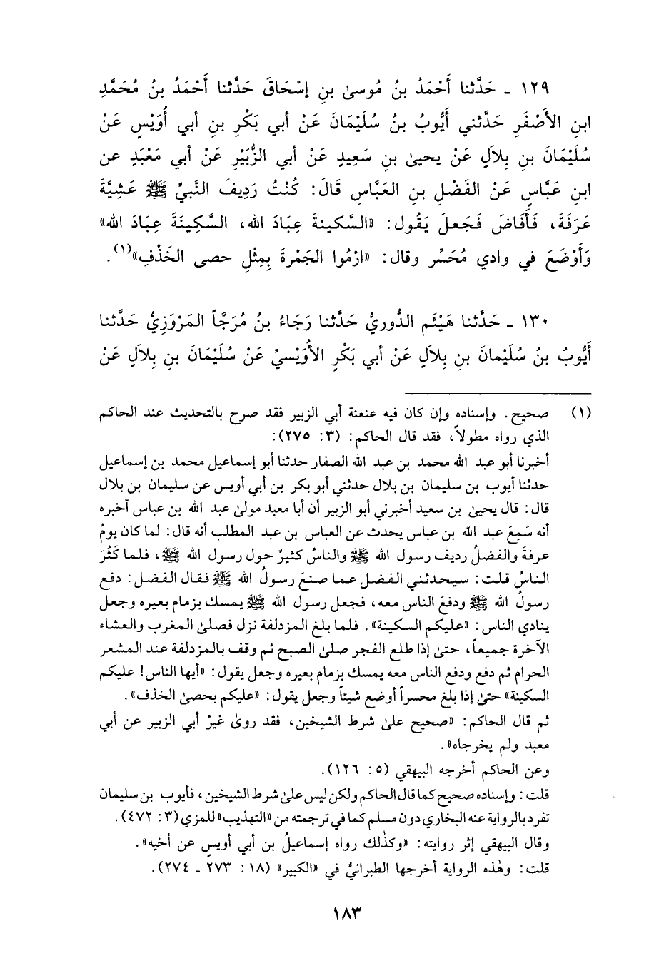 129 - حَدَّثَنَا أَحْمَدُ بْنُ مُوسَى بْنِ إِسْحَاقَ، حَدَّثَنَا أَحْمَدُ بْنُ مُحَمَّدِ بْنِ الْأَصْفَرِ، حَدَّثَنِي أَيُّوبُ بْنُ سُلَيْمَانَ، عَنْ أَبِي بَكْرِ بْنِ أَبِي أُوَيْسٍ، عَنْ سُلَيْمَانَ بْنِ بِلَالٍ، عَنْ يَحْيَى بْنِ سَعِيدٍ، عَنْ أَبِي الزُّبَيْرِ، عَنْ أَبِي مَعْبَدٍ، عَنِ ابْنِ عَبَّاسٍ، عَنِ الْفَضْلِ بْنِ الْعَبَّاسِ قَالَ: " كُنْتُ رَدِيفَ النَّبِيِّ صَلَّى اللهُ عَلَيْهِ وَسَلَّمَ عَشِيَّةَ عَرَفَةَ فَأَفَاضَ فَجَعَلَ يَقُولُ: «السَّكِينَةَ عِبَادَ اللَّهِ , السَّكِينَةَ عِبَادَ اللَّهِ» وَأَوْضَعَ فِي وَادِي مُحَسِّرٍ وَقَالَ: §«ارْمُوا الْجَمْرَةَ بِمِثْلِ حَصَى الْخَذْفِ»