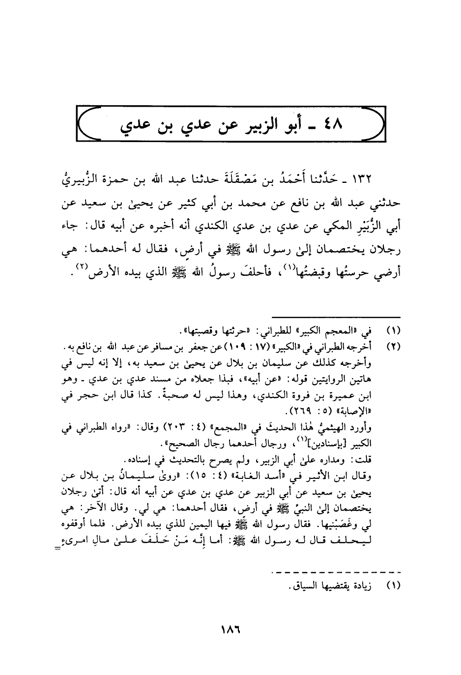 132 - حَدَّثَنَا أَحْمَدُ بْنُ مَصْقَلَةَ، حَدَّثَنَا عَبْدُ اللَّهِ بْنُ حَمْزَةَ الزُّبَيْرِيُّ، حَدَّثَنِي عَبْدُ اللَّهِ بْنُ نَافِعٍ، عَنْ مُحَمَّدِ بْنِ أَبِي كَثِيرٍ، عَنْ يَحْيَى بْنِ سَعِيدٍ، عَنْ أَبِي الزُّبَيْرِ الْمَكِّيِّ، عَنْ عَدِيِّ بْنِ عَدِيٍّ الْكِنْدِيِّ، أَنَّهُ أَخْبَرَهُ، عَنْ أَبِيهِ قَالَ: " جَاءَ رَجُلَانِ يَخْتَصِمَانِ إِلَى رَسُولِ اللَّهِ صَلَّى اللهُ عَلَيْهِ وَسَلَّمَ فِي أَرْضٍ فَقَالَ لَهُ أَحَدُهُمَا: هِيَ أَرْضِي حَرَسْتُهَا وَقَبَضْتُهَا §«فَأَحَلَفَ رَسُولُ اللَّهِ صَلَّى اللهُ عَلَيْهِ وَسَلَّمَ الَّذِي بِيَدِهِ الْأَرْضَ»