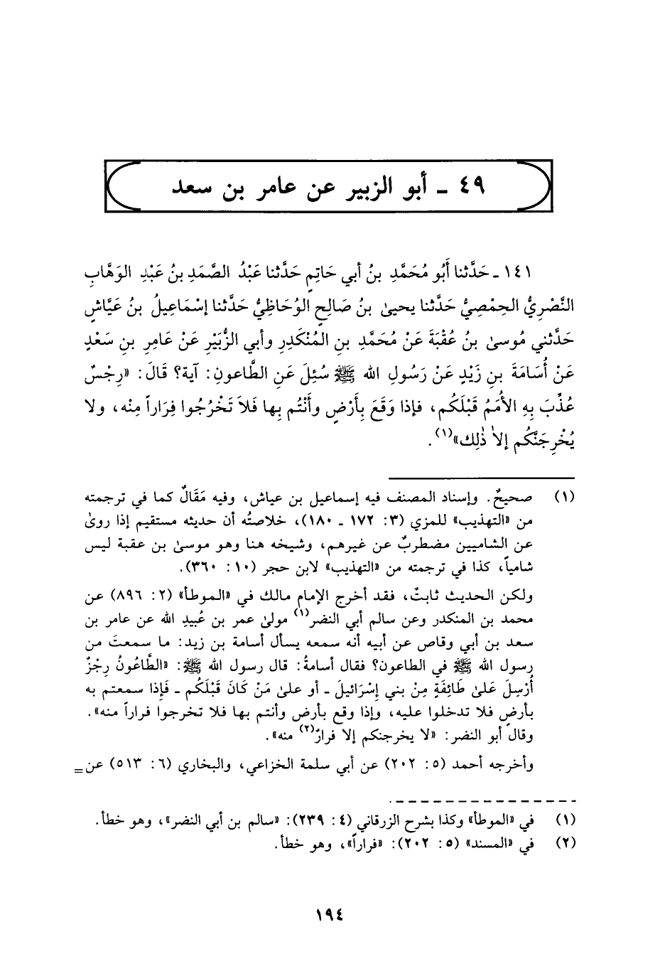 141 - حَدَّثَنَا أَبُو مُحَمَّدِ بْنُ أَبِي حَاتِمٍ، حَدَّثَنَا عَبْدُ الصَّمَدِ بْنُ عَبْدِ الْوَهَّابِ النَّصْرِيُّ الْحِمْصِيُّ، حَدَّثَنَا يَحْيَى بْنُ صَالِحٍ الْوُحَاظِيُّ، حَدَّثَنَا إِسْمَاعِيلُ بْنُ عَيَّاشٍ، حَدَّثَنِي مُوسَى بْنُ عُقْبَةَ، عَنْ مُحَمَّدِ بْنِ الْمُنْكَدِرِ، وَأَبِي الزُّبَيْرِ، عَنْ عَامِرِ بْنِ سَعْدٍ، عَنْ أُسَامَةَ بْنِ زَيْدٍ، عَنْ رَسُولِ اللَّهِ صَلَّى اللهُ عَلَيْهِ وَسَلَّمَ سُئِلَ عَنِ §الطَّاعُونِ، آيَةٌ؟ قَالَ: «رِجْسٌ عُذِّبَ بِهِ الْأُمَمُ قَبْلَكُمْ , فَإِذَا وَقَعَ بِأَرْضٍ وَأَنْتُمْ بِهَا فَلَا تَخْرُجُوا فِرَارًا مِنْهُ وَلَا يُخْرِجَنَّكُمْ إِلَّا ذَلِكَ»