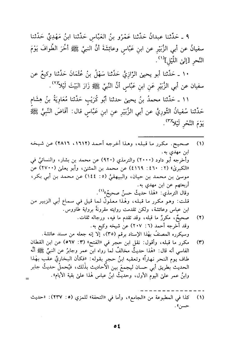 11 - حَدَّثَنَا مُحَمَّدُ بْنُ يَحْيَى، حَدَّثَنَا أَبُو كُرَيْبٍ، حَدَّثَنَا مُعَاوِيَةُ بْنُ هِشَامٍ، حَدَّثَنَا سُفْيَانُ الثَّوْرِيُّ، عَنْ أَبِي الزُّبَيْرِ، عَنِ ابْنِ عَبَّاسٍ، قَالَ: «§أَفَاضَ النَّبِيُّ صَلَّى اللهُ عَلَيْهِ وَسَلَّمَ يَوْمَ النَّحْرِ لَيْلًا»