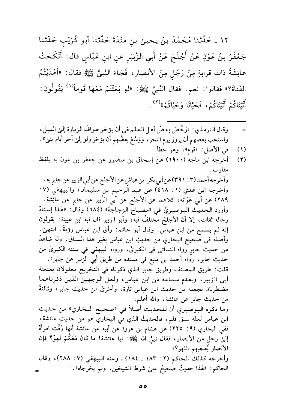 12 - حَدَّثَنَا مُحَمَّدُ بْنُ يَحْيَى بْنِ مَنْدَهْ، حَدَّثَنَا أَبُو كُرَيْبٍ، حَدَّثَنَا جَعْفَرُ بْنُ عَوْنٍ، عَنْ أَجْلَحَ، عَنْ أَبِي الزُّبَيْرِ، عَنِ ابْنِ عَبَّاسٍ، قَالَ: §" أَنْكَحَتْ عَائِشَةُ ذَاتَ قَرَابَةٍ مِنْ رَجُلٍ مِنَ الْأَنْصَارِ فَجَاءَ النَّبِيُّ صَلَّى اللهُ عَلَيْهِ وَسَلَّمَ فَقَالَ: «أَهْدَيْتُمُ الْفَتَاةَ» . فَقَالُوا: نَعَمْ فَقَالَ النَّبِيُّ صَلَّى اللهُ عَلَيْهِ وَسَلَّمَ: " لَوْ بَعَثْتُمْ مَعَهَا قَوْمًا يَقُولُونَ: أَتَيْنَاكُمْ أَتَيْنَاكُمْ فَحَيَّانَا وَحَيَّاكُمْ "