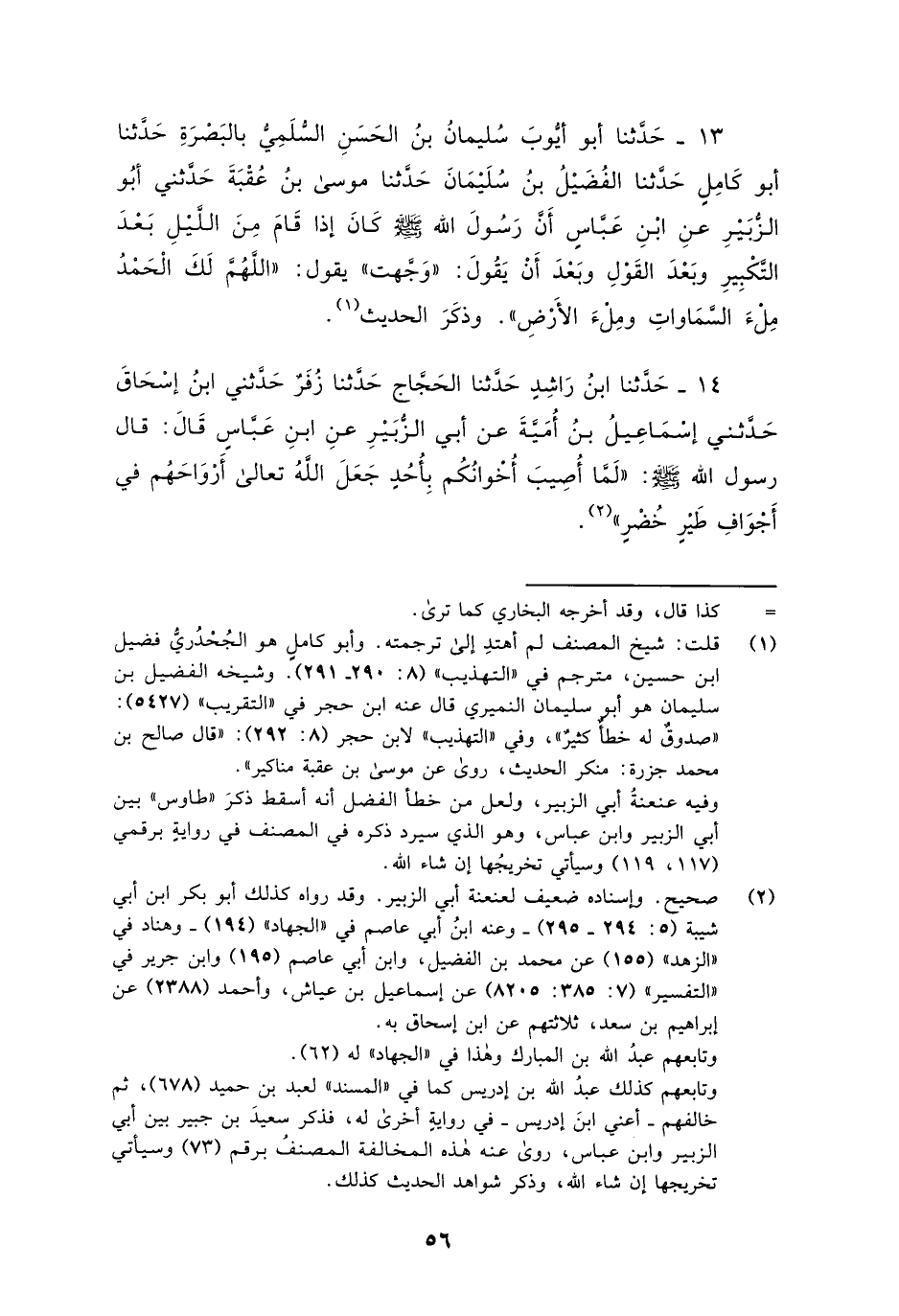 13 - حَدَّثَنَا أَبُو أَيُّوبَ سُلَيْمَانُ بْنُ الْحَسَنِ السُّلَمِيُّ، بِالْبَصْرَةِ , حَدَّثَنَا أَبُو كَامِلٍ، حَدَّثَنَا الْفُضَيْلُ بْنُ سُلَيْمَانَ، حَدَّثَنَا مُوسَى بْنُ عُقْبَةَ، حَدَّثَنِي أَبُو الزُّبَيْرِ، عَنِ ابْنِ عَبَّاسٍ " أَنَّ رَسُولَ اللَّهِ صَلَّى اللهُ عَلَيْهِ وَسَلَّمَ §كَانَ إِذَا قَامَ مِنَ اللَّيْلِ بَعْدَ التَّكْبِيرِ وَبَعْدَ الْقَوْلِ أَنْ يَقُولَ وَجَّهْتُ يَقُولُ: «اللَّهُمَّ لَكَ الْحَمْدُ مِلْءَ السَّمَاوَاتِ وَمِلْءَ الْأَرْضِ» وَذَكَرَ الْحَدِيثَ