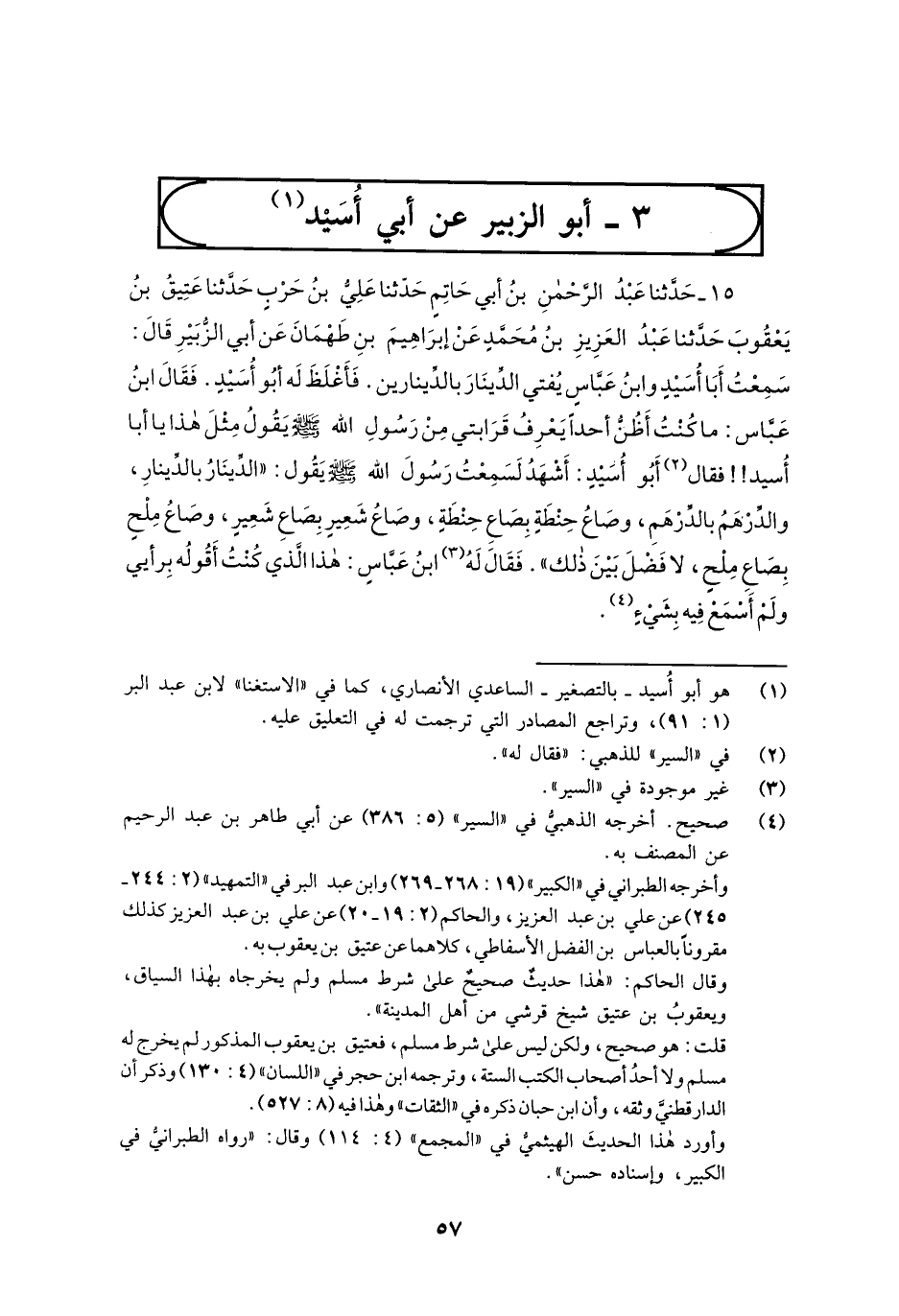 15 - حَدَّثَنَا عَبْدُ الرَّحْمَنِ بْنُ أَبِي حَاتِمٍ، حَدَّثَنَا عَلِيُّ بْنُ حَرْبٍ، حَدَّثَنَا عَتِيقُ بْنُ يَعْقُوبَ، حَدَّثَنَا عَبْدُ الْعَزِيزِ بْنُ مُحَمَّدٍ، عَنْ إِبْرَاهِيمَ بْنِ طَهْمَانَ، عَنْ أَبِي الزُّبَيْرِ، قَالَ: سَمِعْتُ أَبَا أُسَيْدٍ، وَابْنَ عَبَّاسٍ يُفْتِي: «الدِّينَارُ بِالدِّينَارَيْنِ» فَأَغْلَظَ لَهُ أَبُو أُسَيْدٍ فَقَالَ ابْنُ عَبَّاسٍ: «مَا كُنْتُ أَظُنَّ أَحَدًا يَعْرِفُ قَرَابَتِي مِنْ رَسُولِ اللَّهِ صَلَّى اللهُ عَلَيْهِ وَسَلَّمَ يَقُولُ مِثْلَ هَذَا يَا أَبَا أُسَيْدٍ» فَقَالَ أَبُو أُسَيْدٍ: أَشْهَدُ لَسَمِعْتُ رَسُولَ اللَّهِ صَلَّى اللهُ عَلَيْهِ وَسَلَّمَ يَقُولُ: §«الدِّينَارُ بِالدِّينَارِ , وَالدِّرْهَمُ بِالدِّرْهَمِ , وَصَاعُ حِنْطَةٍ بِصَاعِ حِنْطَةٍ , وَصَاعُ شَعِيرٍ بِصَاعِ شَعِيرٍ , وَصَاعُ مِلْحٍ بِصَاعِ مِلْحٍ , لَا فَضْلَ بَيْنَ ذَلِكَ» فَقَالَ لَهُ ابْنُ عَبَّاسٍ: «هَذَا الَّذِي كُنْتُ أَقُولُهُ بِرَأْيِي وَلَمْ أَسْمَعْ فِيهِ بِشَيْءٍ»