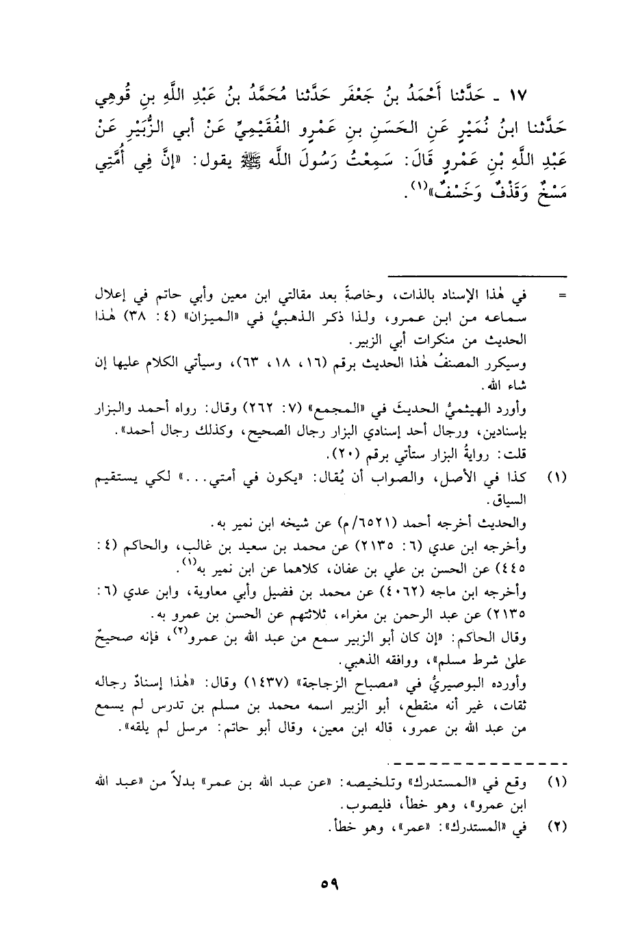 17 - حَدَّثَنَا أَحْمَدُ بْنُ جَعْفَرٍ، حَدَّثَنَا مُحَمَّدُ بْنُ عَبْدِ اللَّهِ بْنِ قوهي، حَدَّثَنَا ابْنُ نُمَيْرٍ، عَنِ الْحَسَنِ بْنِ عَمْرِو الْفُقَيْمِيِّ، عَنْ أَبِي الزُّبَيْرِ، عَنْ عَبْدِ اللَّهِ بْنِ عَمْرٍو، قَالَ: سَمِعْتُ رَسُولَ اللَّهِ صَلَّى اللهُ عَلَيْهِ وَسَلَّمَ يَقُولُ: «إنَّ §فِي أُمَّتِي مَسْخًا، وَقَذْفًا، وَخَسْفًا»
