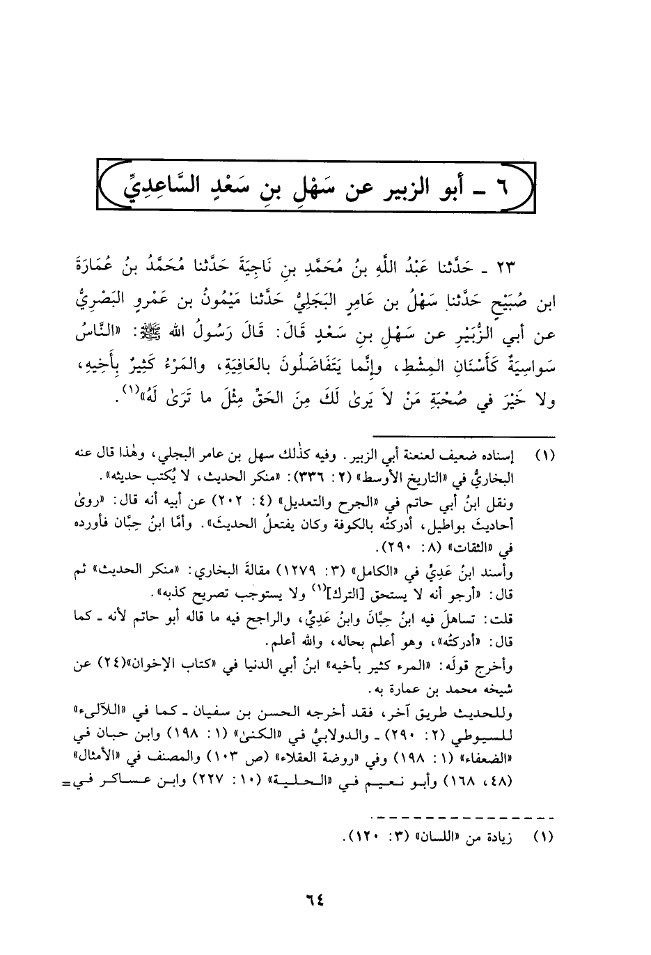 23 - حَدَّثَنَا عَبْدُ اللَّهِ بْنُ مُحَمَّدِ بْنِ نَاجِيَةَ، حَدَّثَنَا مُحَمَّدُ بْنُ عُمَارَةَ بْنِ صُبَيْحٍ، حَدَّثَنَا سَهْلُ بْنُ عَامِرٍ الْبَجَلِيُّ، حَدَّثَنَا مَيْمُونُ بْنُ عَمْرٍو الْبَصْرِيُّ، عَنْ أَبِي الزُّبَيْرِ، عَنْ سَهْلِ بْنِ سَعْدٍ قَالَ: قَالَ رَسُولُ اللَّهِ صَلَّى اللهُ عَلَيْهِ وَسَلَّمَ: «§النَّاسُ سَوَاسِيَةٌ كَأَسْنَانِ الْمِشْطِ وَإِنَّمَا يَتَفَاضَلُونَ بِالْعَافِيَةِ , وَالْمَرْءُ كَثِيرٌ بِأَخِيهِ , وَلَا خَيْرَ فِي صُحْبَةِ مَنْ لَا يَرَى لَكَ مِنَ الْحَقِّ مِثْلَ مَا تَرَى لَهُ»