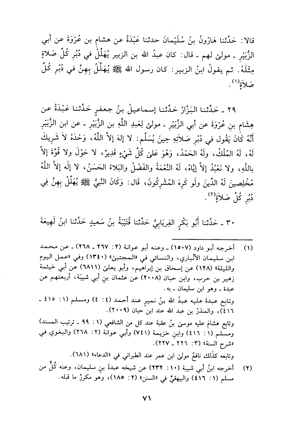 29 - حَدَّثَنَا الْبَزَّارُ، حَدَّثَنَا إِسْمَاعِيلُ بْنُ جَعْفَرٍ، حَدَّثَنَا عَبْدَةُ، عَنْ هِشَامِ بْنِ عُرْوَةَ، عَنْ أَبِي الزُّبَيْرِ، مَوْلًا لِعَبْدِ اللَّهِ بْنِ الزُّبَيْرِ , عَنِ ابْنِ الزُّبَيْرِ " أَنَّهُ كَانَ §يَقُولُ فِي دُبُرِ صَلَاتِهِ حِينَ يُسَلِّمُ: لَا إِلَهَ إِلَّا اللَّهُ، وَحْدَهُ لَا شَرِيكَ لَهُ , لَهُ الْمُلْكُ، وَلَهُ الْحَمْدُ، وَهُوَ عَلَى كُلِّ شَيْءٍ قَدِيرٌ , لَا حَوْلَ وَلَا قُوَّةَ إِلَّا بِاللَّهِ , وَلَا نَعْبُدُ إِلَّا إِيَّاهُ , لَهُ النِّعْمَةُ وَالْفَضْلُ وَالْبَلَاءُ الْحَسَنُ لَا إِلَهَ إِلَّا اللَّهُ مُخْلِصِينَ لَهُ الدِّينَ وَلَوْ كَرِهَ الْمُشْرِكُونَ ". قَالَ: «وَكَانَ النَّبِيُّ صَلَّى اللهُ عَلَيْهِ وَسَلَّمَ يُهَلِّلُ بِهِنَّ فِي دُبُرِ كُلِّ صَلَاةٍ»