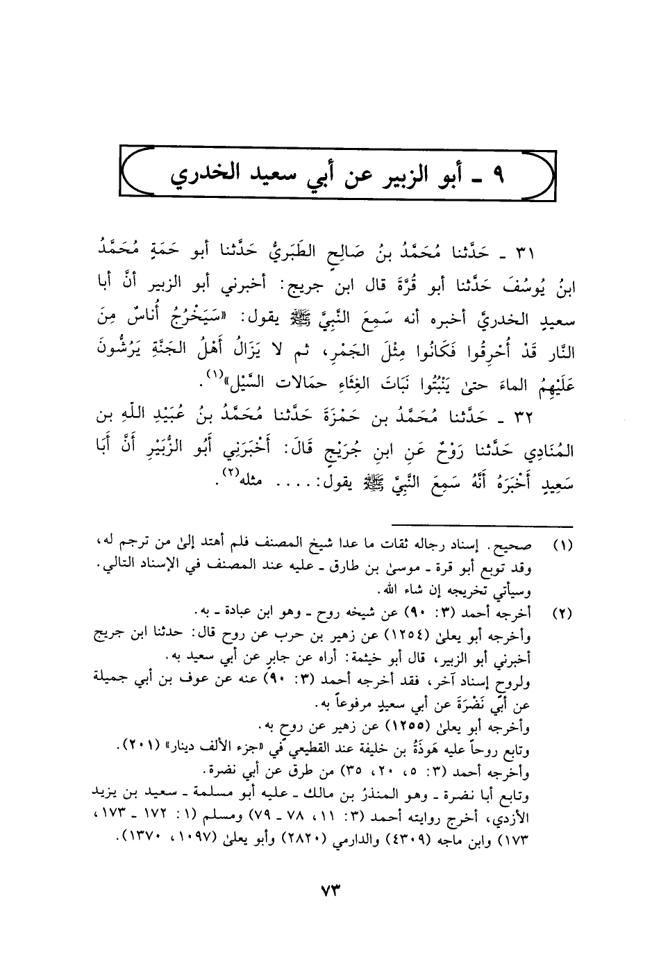 31 - حَدَّثَنَا مُحَمَّدُ بْنُ صَالِحٍ الطَّبَرِيُّ، حَدَّثَنَا أَبُو حُمَةَ مُحَمَّدُ بْنُ يُوسُفَ , حَدَّثَنَا أَبُو قُرَّةَ، قَالَ ابْنُ جُرَيْجٍ: أَخْبَرَنِي أَبُو الزُّبَيْرِ، أَنَّ أَبَا سَعِيدٍ الْخُدْرِيِّ، أَخْبَرَهُ أَنَّهُ، سَمِعَ النَّبِيَّ صَلَّى اللهُ عَلَيْهِ وَسَلَّمَ يَقُولُ: «§سَيَخْرُجُ أُنَاسٌ مِنَ النَّارِ قَدْ أُحْرِقُوا فَكَانُوا مِثْلَ الْجَمْرِ ثُمَّ لَا يَزَالُ أَهْلُ الْجَنَّةِ يَرُشُّونَ عَلَيْهِمُ الْمَاءَ حَتَّى يَنْبُتُوا نَبَاتَ الْغُثَاءِ حَمَّالَاتِ السَّيْلِ»