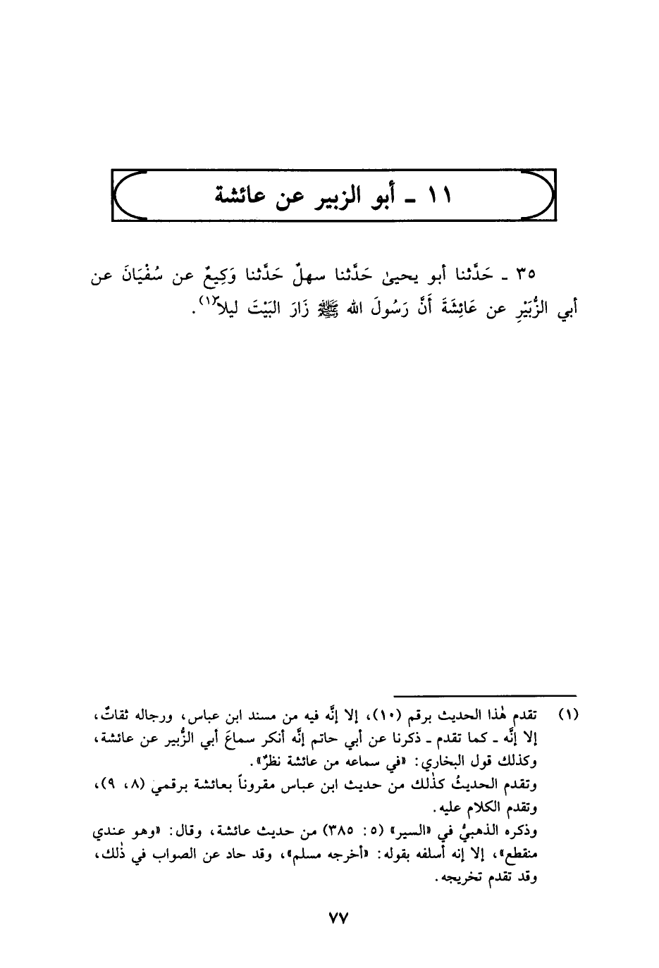 35 - حَدَّثَنَا أَبُو يَحْيَى، حَدَّثَنَا سَهْلٌ، حَدَّثَنَا وَكِيعٌ، عَنْ سُفْيَانَ، عَنْ أَبِي الزُّبَيْرِ، عَنْ عَائِشَةَ «أَنَّ §رَسُولَ اللَّهِ صَلَّى اللهُ عَلَيْهِ وَسَلَّمَ زَارَ الْبَيْتَ لَيْلًا»