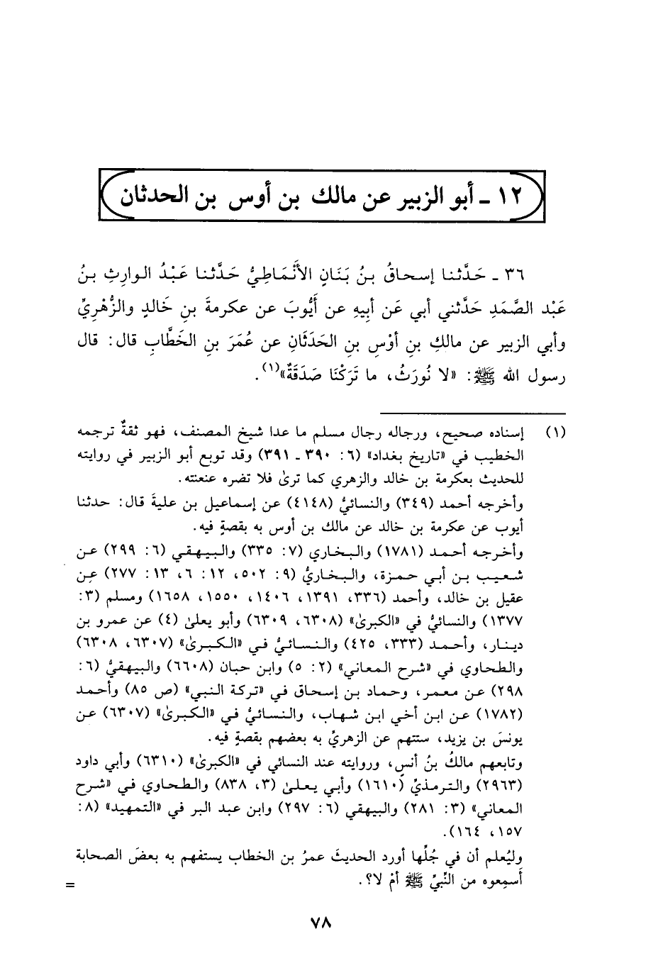 36 - حَدَّثَنَا إِسْحَاقُ بْنُ بَنَانٍ الْأَنْمَاطِيُّ، حَدَّثَنَا عَبْدُ الْوَارِثِ بْنُ عَبْدِ الصَّمَدِ، حَدَّثَنِي أَبَى، عَنْ أَبِيهِ، عَنْ أَيُّوبَ، عَنْ عِكْرِمَةَ بْنِ خَالِدٍ، وَالزُّهْرِيِّ، وَأَبِي الزُّبَيْرِ، عَنْ مَالِكِ بْنِ أَوْسِ بْنِ الْحَدَثَانِ، عَنْ عُمَرَ بْنِ الْخَطَّابِ قَالَ: قَالَ رَسُولُ اللَّهِ صَلَّى اللهُ عَلَيْهِ وَسَلَّمَ: §«لَا نُورَثُ مَا تَرَكْنَا صَدَقَةٌ»