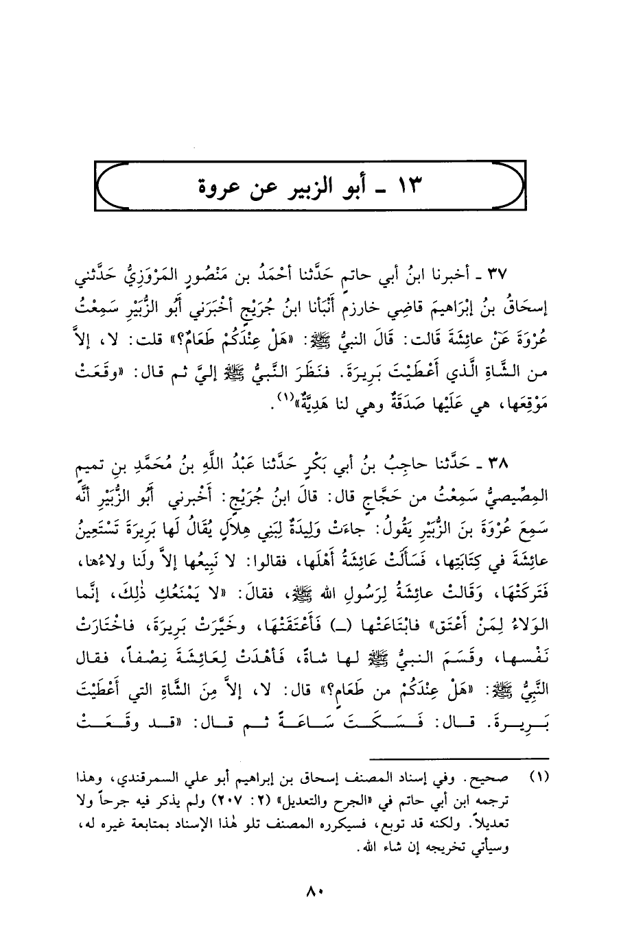 37 - أَخْبَرَنَا ابْنُ أَبِي حَاتِمٍ، حَدَّثَنَا أَحْمَدُ بْنُ مَنْصُورٍ الْمَرْوَزِيُّ، حَدَّثَنِي إِسْحَاقُ بْنُ إِبْرَاهِيمَ، قَاضِي خَوَارَزْمَ أَنْبَأَنَا ابْنُ جُرَيْجٍ، أَخْبَرَنِي أَبُو الزُّبَيْرِ، سَمِعْتُ عُرْوَةَ، عَنْ عَائِشَةَ، قَالَتْ: قَالَ النَّبِيُّ صَلَّى اللهُ عَلَيْهِ وَسَلَّمَ: «§هَلْ عِنْدَكُمْ طَعَامٌ؟» قُلْتُ: لَا إِلَّا مِنَ الشَّاةِ الَّذِي أَعْطَيْتَ بَرِيرَةَ فَنَظَرَ النَّبِيُّ صَلَّى اللهُ عَلَيْهِ وَسَلَّمَ إِلَيَّ ثُمَّ قَالَ: «وَقَعَتْ مَوْقِعَهَا وَهِيَ عَلَيْهَا صَدَقَةٌ وَهِيَ لَنَا هَدِيَّةٌ»
