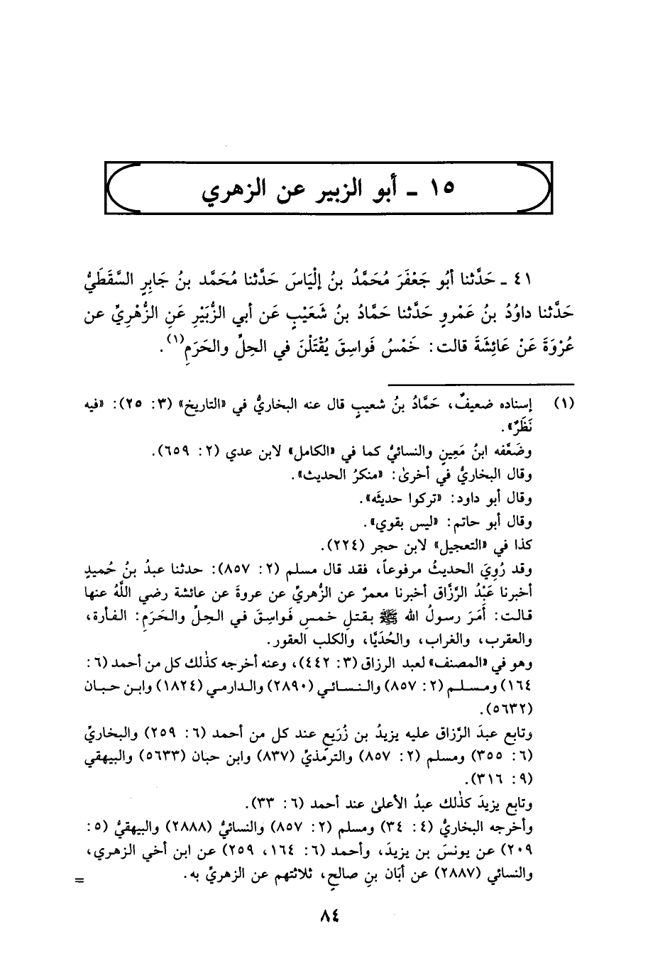 41 - حَدَّثَنَا أَبُو جَعْفَرٍ مُحَمَّدُ بْنُ إِلْيَاسَ، حَدَّثَنَا مُحَمَّدُ بْنُ جَابِرٍ السَّقَطِيُّ، حَدَّثَنَا دَاوُدُ بْنُ عَمْرٍو، حَدَّثَنَا حَمَّادُ بْنُ شُعَيْبٍ، عَنْ أَبِي الزُّبَيْرِ، عَنِ الزُّهْرِيِّ، عَنْ عُرْوَةَ، عَنْ عَائِشَةَ، قَالَتْ: §«خَمْسُ فَوَاسِقَ يُقْتَلْنَ فِي الْحِلِّ، وَالْحَرَمِ»