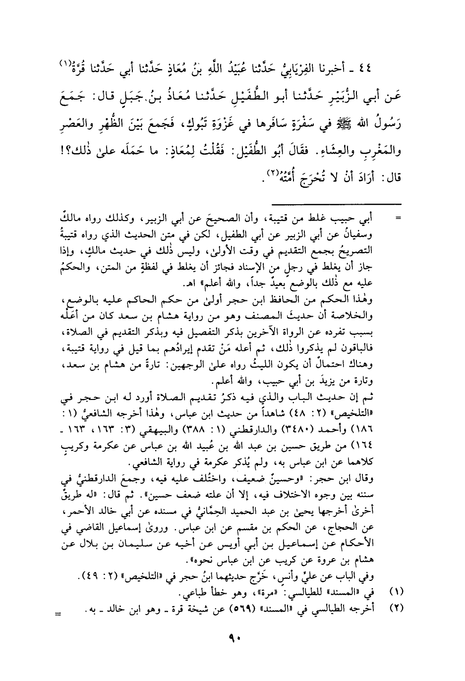 44 - أَخْبَرَنَا الْفِرْيَابِيُّ، حَدَّثَنَا عُبَيْدُ اللَّهِ بْنُ مُعَاذٍ، حَدَّثَنَا أَبِي، حَدَّثَنَا قُرَّةُ، عَنْ أَبِي الزُّبَيْرِ، حَدَّثَنَا أَبُو الطُّفَيْلِ، حَدَّثَنَا مُعَاذُ بْنُ جَبَلٍ قَالَ: §«جَمَعَ رَسُولُ اللَّهِ صَلَّى اللهُ عَلَيْهِ وَسَلَّمَ فِي سَفْرَةٍ سَافَرَهَا فِي غَزْوَةِ تَبُوكَ فَجَمَعَ بَيْنَ الظُّهْرِ وَالْعَصْرِ وَالْمَغْرِبِ وَالْعِشَاءِ» فَقَالَ أَبُو الطُّفَيْلِ: فَقُلْتُ: لِمُعَاذٍ مَا حَمَلَهُ عَلَى ذَلِكَ؟ قَالَ: أَرَادَ أَنْ لَا تُحْرَجَ أُمَّتُهُ