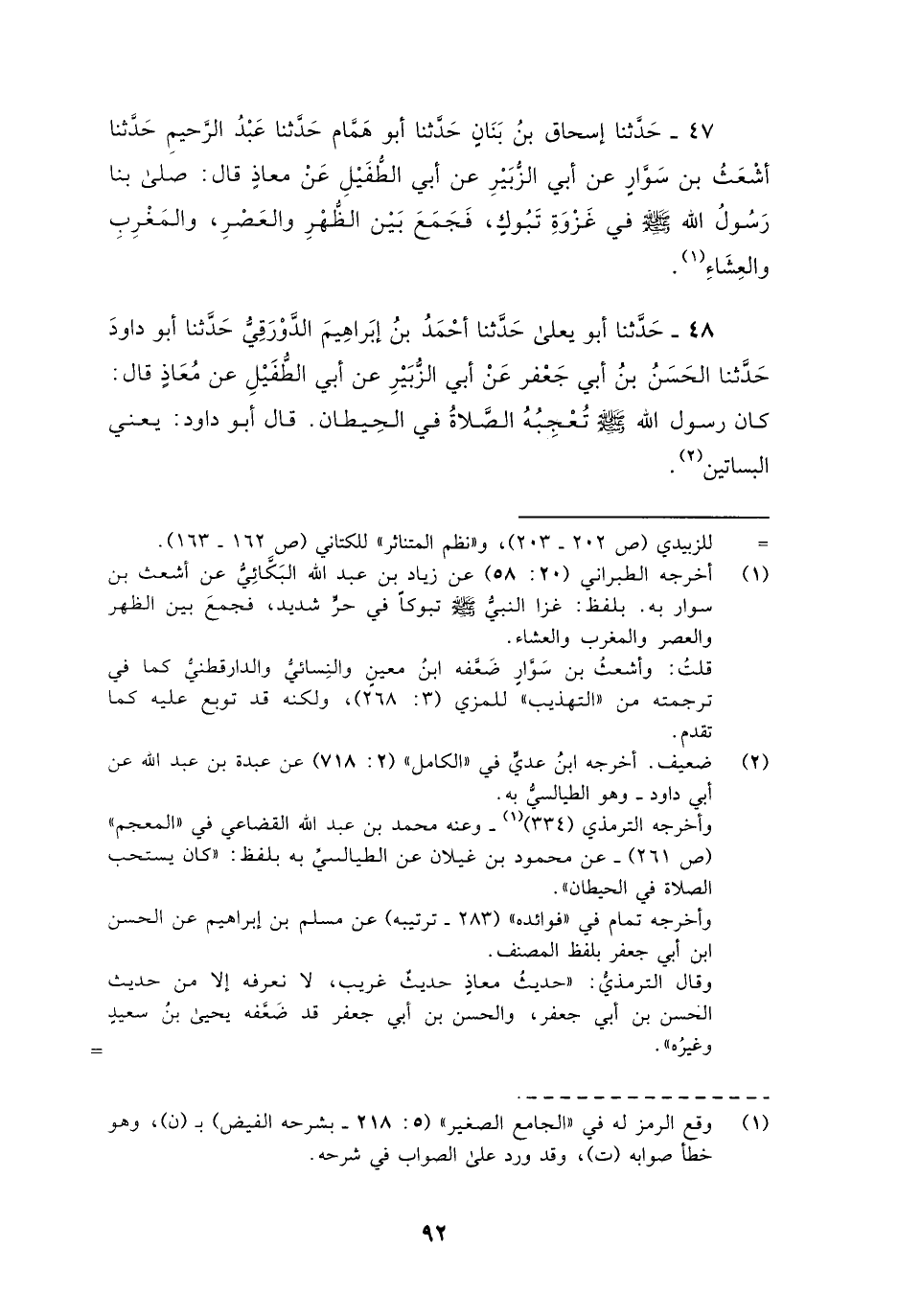47 - حَدَّثَنَا إِسْحَاقُ بْنُ بَنَانٍ، حَدَّثَنَا أَبُو هَمَّامٍ، حَدَّثَنَا عَبْدُ الرَّحِيمِ، حَدَّثَنَا أَشْعَثُ بْنُ سَوَّارٍ، عَنْ أَبِي الزُّبَيْرِ، عَنْ أَبِي الطُّفَيْلِ، عَنْ مُعَاذٍ، قَالَ: «صَلَّى بِنَا رَسُولُ اللَّهِ صَلَّى اللهُ عَلَيْهِ وَسَلَّمَ فِي غَزْوَةِ تَبُوكَ §فَجَمَعَ بَيْنَ الظُّهْرِ وَالْعَصْرِ، وَالْمَغْرِبِ وَالْعِشَاءِ»