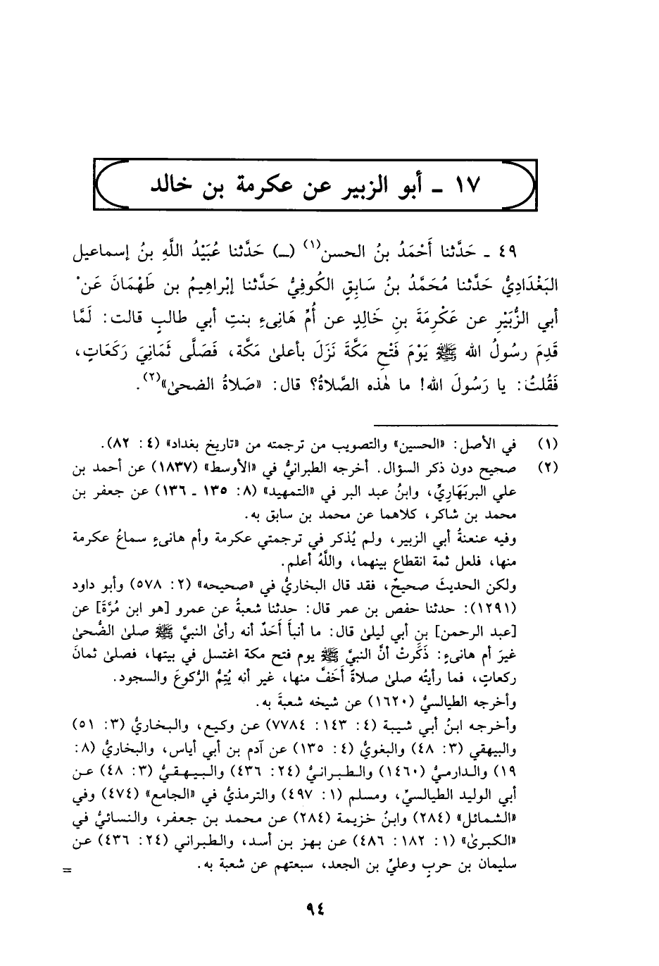 49 - حَدَّثَنَا أَحْمَدُ بْنُ الْحَسَنِ، حَدَّثَنَا عُبَيْدُ اللَّهِ بْنُ إِسْمَاعِيلَ الْبَغْدَادِيُّ، حَدَّثَنَا مُحَمَّدُ بْنُ سَابِقٍ الْكُوفِيُّ، حَدَّثَنَا إِبْرَاهِيمُ بْنُ طَهْمَانَ، عَنْ أَبِي الزُّبَيْرِ، عَنْ عِكْرِمَةَ بْنِ خَالِدٍ، عَنْ أُمِّ هَانِئِ بِنْتِ أَبِي طَالِبٍ، قَالَتْ: " لَمَّا قَدِمَ رَسُولُ اللَّهِ صَلَّى اللهُ عَلَيْهِ وَسَلَّمَ يَوْمَ فَتْحِ مَكَّةَ نَزَلَ بِأَعْلَى مَكَّةَ فَصَلَّى ثَمَانِيَ رَكَعَاتٍ فَقُلْتُ: يَا رَسُولَ اللَّهِ مَا هَذِهِ الصَّلَاةُ؟ قَالَ: §«صَلَاةُ الضُّحَى»
