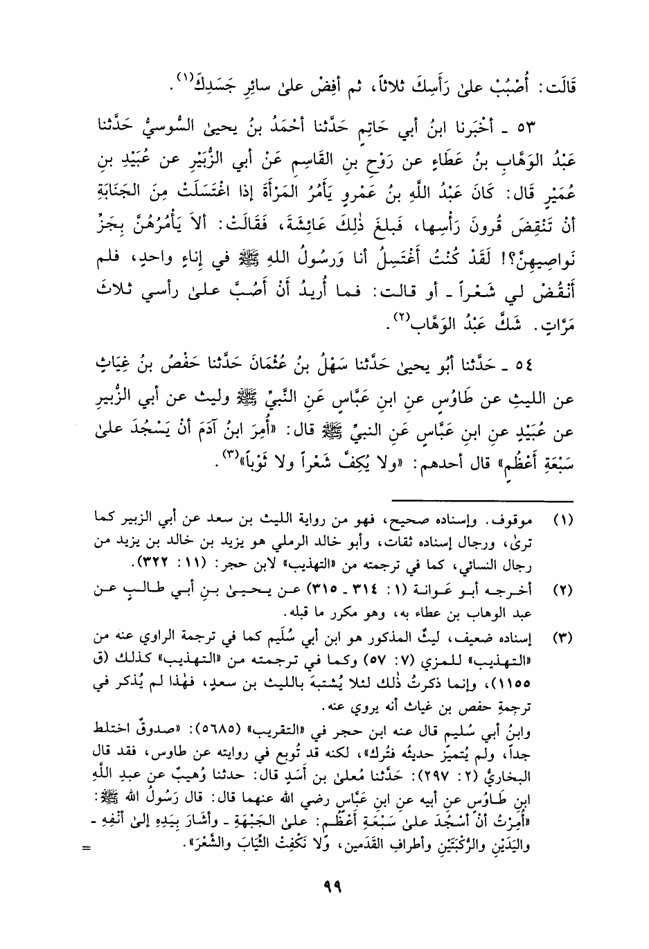 53 - أَخْبَرَنَا ابْنُ أَبِي حَاتِمٍ، حَدَّثَنَا أَحْمَدُ بْنُ يَحْيَى السُّوسِيُّ، حَدَّثَنَا عَبْدُ الْوَهَّابِ بْنُ عَطَاءٍ، عَنْ رَوْحِ بْنِ الْقَاسِمِ، عَنْ أَبِي الزُّبَيْرِ، عَنْ عُبَيْدِ بْنِ عُمَيْرٍ، قَالَ: كَانَ عَبْدُ اللَّهِ بْنُ عَمْرٍو يَأْمُرُ الْمَرْأَةَ إِذَا اغْتَسَلَتْ مِنَ الْجَنَابَةِ أَنْ تَنْقُضَ قُرُونَ رَأْسِهَا فَبَلَغَ ذَلِكَ عَائِشَةَ فَقَالَتْ: «أَلَا يَأْمُرُهُنَّ بِجَزِّ نَوَاصِيهِنَّ لَقَدْ §كُنْتُ أَغْتَسِلُ أَنَا وَرَسُولُ اللَّهِ صَلَّى اللهُ عَلَيْهِ وَسَلَّمَ فِي إِنَاءٍ وَاحِدٍ فَلَمْ أَنْقُضْ لِي شَعَرًا، أَوْ قَالَتْ فَمَا أُرِيدُ أَنْ أُصُبَّ عَلَى رَأْسِي ثَلَاثَ مَرَّاتٍ» شَكَّ عَبْدُ الْوَهَّابِ
