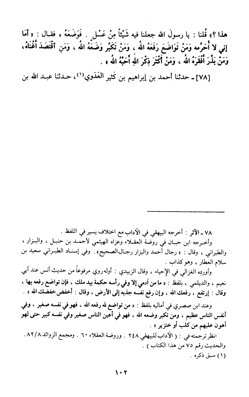 78 - حَدَّثَنَا أَحْمَدُ بْنُ إِبْرَاهِيمَ بْنِ كَثِيرٍ الْعَدَوِيُّ، حَدَّثَنَا عَبْدُ اللَّهِ بْنُ -[103]- إِدْرِيسَ، حَدَّثَنِي ابْنُ عَجْلَانَ، عَنْ بُكَيْرِ بْنِ عَبْدِ اللَّهِ بْنِ الْأَشَجِّ، عَنْ مَعْمَرِ -[104]- بْنِ أَبِي حَبِيبَةَ، عَنْ عُبَيْدِ اللَّهِ بْنِ عَدِيِّ بْنِ الْخِيَارِ قَالَ: سَمِعْتُ عُمَرَ بْنَ الْخَطَّابِ، يَقُولُ " فِي §الْعَبْدِ إِذَا تَوَاضَعَ لِلَّهِ عَزَّ وَجَلَّ رَفَعَ اللَّهُ حَكَمَتَهُ، وَقَالَ: «انْتَعِشْ رَفَعَكَ اللَّهُ» وَإِذَا تَكَبَّرَ وَعَدَا طَوْرَهُ وَهَصَهُ اللَّهُ إِلَى الْأَرْضِ وَقَالَ: «اخْسَأْ خَسَأَكَ اللَّهُ» فَهُوَ فِي نَفْسِهِ عَظِيمٌ وَفِي أَعْيُنِ النَّاسِ حَقِيرٌ حَتَّى إِنَّهُ عِنْدَهُمْ مِنَ الْخِنْزِيرِ، أَيُّهَا النَّاسُ لَا تُبَغِّضُوا اللَّهَ إِلَى الْعِبَادِ قِيلَ: وَكَيْفَ ذَلِكَ؟ قَالَ: يَقُومُ أَحَدُكُمْ إِمَامًا فَيُطَوِّلُ عَلَيْهِمْ فَيُبَغِّضُ إِلَيْهِمْ مَا هُمْ فِيهِ "