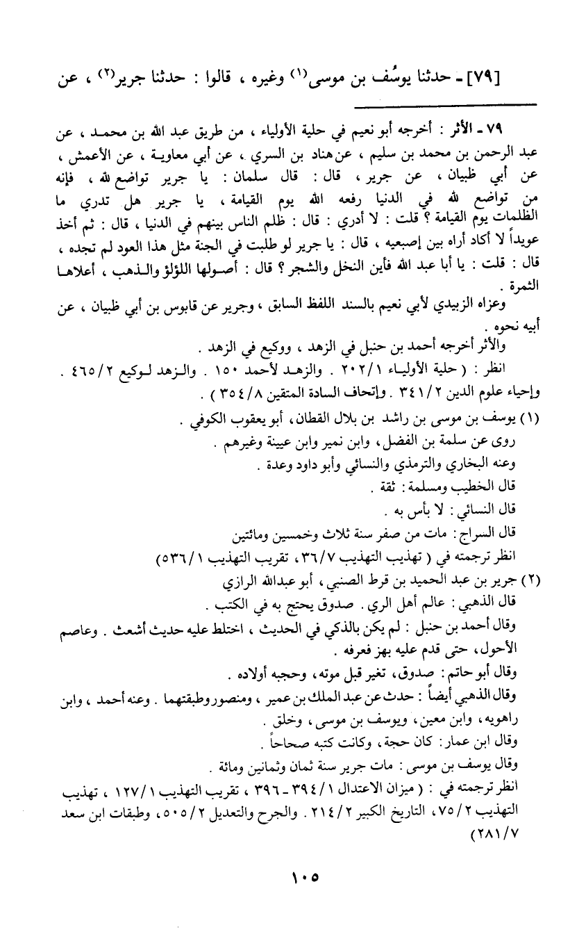 79 - حَدَّثَنَا يُوسُفُ بْنُ مُوسَى، وَغَيْرُهُ، قَالُوا: حَدَّثَنَا جَرِيرٌ، عَنْ -[106]- قَابُوسَ، عَنْ أَبِيهِ، قَالَ: لَقِيتُ جَرِيرَ بْنَ عَبْدِ اللَّهِ وَهُوَ جَاءٍ مِنَ الشَّامِ فَسَارَ بِي فَقَالَ: انْتَهَيْتُ مَرَّةً إِلَى شَجَرَةٍ تَحْتَهَا رَجُلٌ قَائِمٌ قَدِ اسْتَظَلَّ بِنِطَعٍ لَهُ وَقَدْ جَاوَزَتِ الشَّمْسُ النِّطَعَ فَسَوَّيْتُهُ عَلَيْهِ ثُمَّ إِنَّ الرَّجُلَ اسْتَيْقَظَ فَإِذَا هُوَ سَلْمَانُ الْفَارِسِيُّ، فَذَكَرْتُ لَهُ مَا صَنَعْتُ فَقَالَ: " يَا جَرِيرُ §تَوَاضَعْ لِلَّهِ عَزَّ وَجَلَّ فِي الدُّنْيَا فَإِنَّهُ مَنْ تَوَاضَعَ لِلَّهِ عَزَّ وَجَلَّ فِي الدُّنْيَا رَفَعَهُ اللَّهُ يَوْمَ الْقِيَامَةِ، يَا جَرِيرُ، أَتَدْرِي مَا ظُلْمَةُ النَّارِ يَوْمَ الْقِيَامَةِ؟ قُلْتُ: لَا قَالَ: فَإِنَّهُ ظُلْمُ بَعْضِهِمْ بَعْضًا فِي الدُّنْيَا "