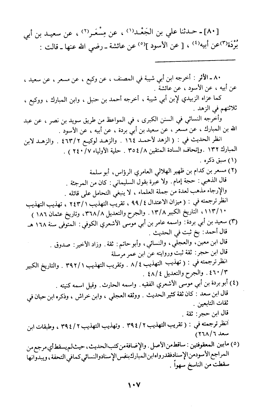 80 - حَدَّثَنَا عَلِيُّ بْنُ الْجَعْدِ، عَنْ مِسْعَرٍ، عَنْ سَعِيدِ بْنِ أَبِي بُرْدَةَ، عَنْ أَبِيهِ، عَنْ عَائِشَةَ رَضِيَ اللَّهُ عَنْهَا، قَالَتْ: «§إِنَّكُمْ لَتَغْفُلُونَ أَفْضَلَ الْعِبَادَةِ التَّوَاضُعَ»