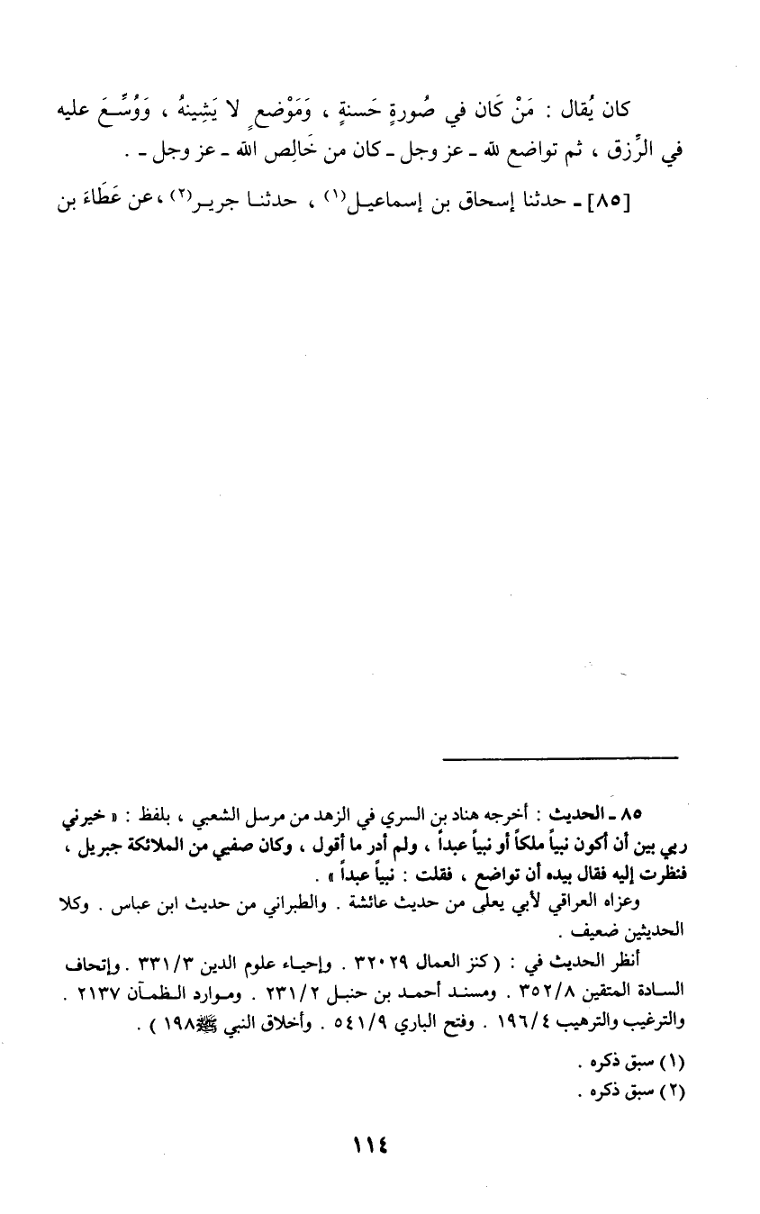 85 - حَدَّثَنَا إِسْحَاقُ بْنُ إِسْمَاعِيلَ، حَدَّثَنَا جَرِيرٌ، عَنْ عَطَاءِ بْنِ -[115]- السَّائِبِ، عَنِ الشَّعْبِيِّ قَالَ: قَالَ رَسُولُ اللَّهِ صَلَّى اللهُ عَلَيْهِ وَسَلَّمَ: " §خَيَّرَنِي رَبِّي بَيْنَ أَمْرَيْنِ: عَبْدًا رَسُولًا أَوْ مَلَكًا نَبِيًّا، فَلَمْ أَدْرِ أَيُّهُمَا أَخْتَارُ، وَكَانَ صَفِيِّي مِنَ الْمَلَائِكَةِ جِبْرِيلُ، فَرَفَعْتُ رَأْسِي فَقَالَ: تَوَاضَعْ لِرَبِّكَ، فَقُلْتُ: عَبْدًا رَسُولًا "