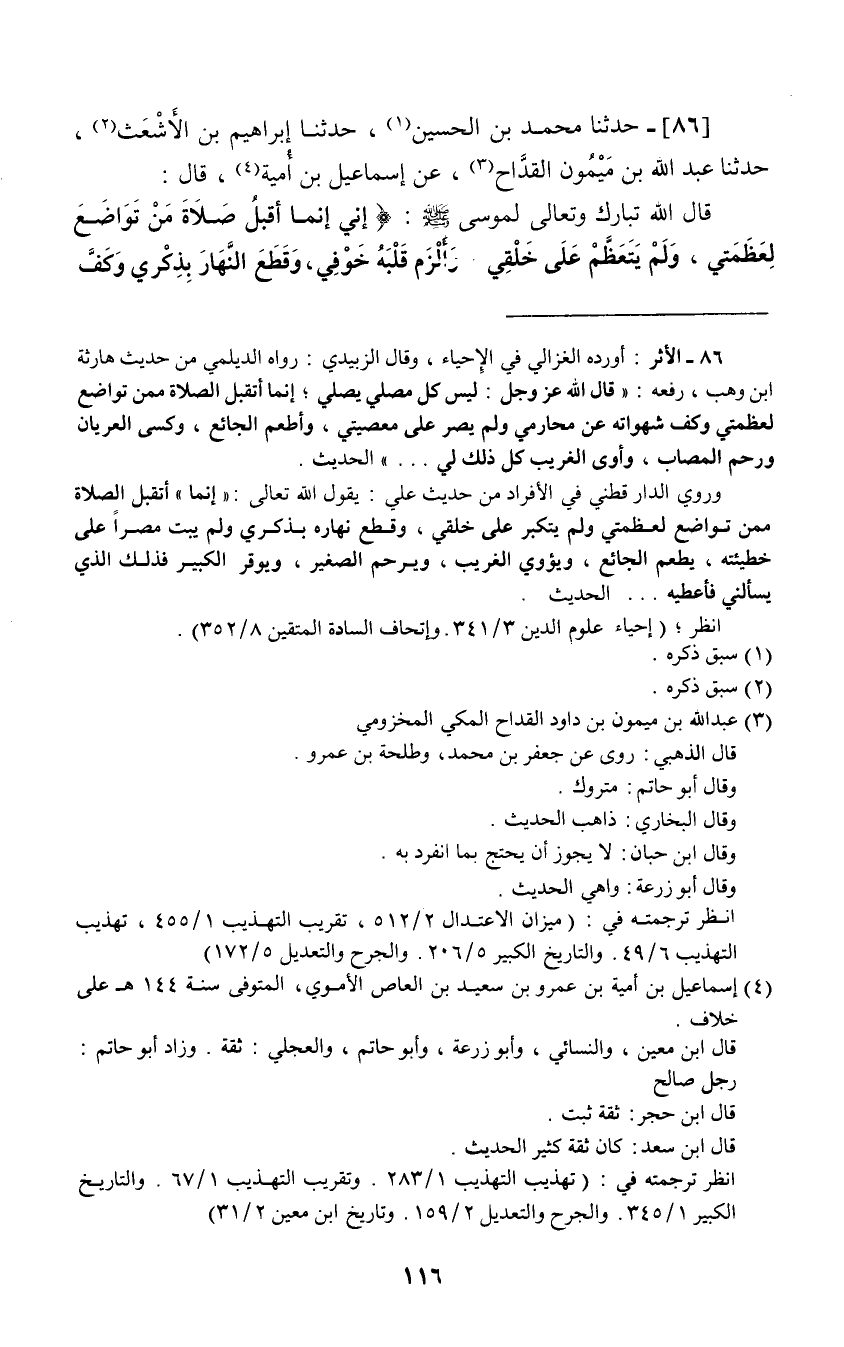 86 - حَدَّثَنَا مُحَمَّدُ بْنُ الْحُسَيْنِ، حَدَّثَنَا إِبْرَاهِيمُ بْنُ الْأَشْعَثِ، حَدَّثَنَا عَبْدُ اللَّهِ بْنُ مَيْمُونٍ الْقَدَّاحُ، عَنْ إِسْمَاعِيلَ بْنِ أُمَيَّةَ قَالَ: " قَالَ اللَّهُ تَبَارَكَ وَتَعَالَى لِمُوسَى صَلَّى اللهُ عَلَيْهِ وَسَلَّمَ: إِنِّي إِنَّمَا §أَقْبَلُ صَلَاةَ مَنْ تَوَاضَعَ لِعَظَمَتِي، وَلَمْ يَتَعَظَّمْ عَلَى خَلْقِي، وَأَلْزَمَ قَلْبَهُ خَوْفِي، وَقَطَعَ النَّهَارَ بِذِكْرِي، وَكَفَّ نَفْسَهُ عَنِ الشَّهَوَاتِ مِنْ أَجْلِي، وَأَطْعَمَ الْجَائِعَ، وَكَسَى الْعَارِيَ، وَأَوَى الْغَرِيبَ فَذَلِكَ الَّذِي يُشْرِقُ نُورُ وَجْهِهِ يَوْمَ الْقِيَامَةِ مِثْلَ الشَّمْسِ، يَدْعُونِي فَأُلَبِّي لَهُ، وَيَسْأَلُنِي فَأُعْطِيهِ، وَأَجْعَلُ لَهُ فِي الْجَهَالَةِ حِلْمًا، وَفِي الظُّلُمَاتِ نُورًا، أَكْلَؤُهُ بِعِزَّتِي، وَأَسْتَحْفِظُهُ مَلَائِكَتِي فَمَثَلُ ذَلِكَ الْعَبْدِ فِي النَّاسِ كَمَثَلِ جَنَّاتِ عَدْنٍ فِي الْجِنَانِ لَا تَنْقَطِعُ ثِمَارُهَا وَلَا تُغَيَّرُ عَنْ حَالِهَا "