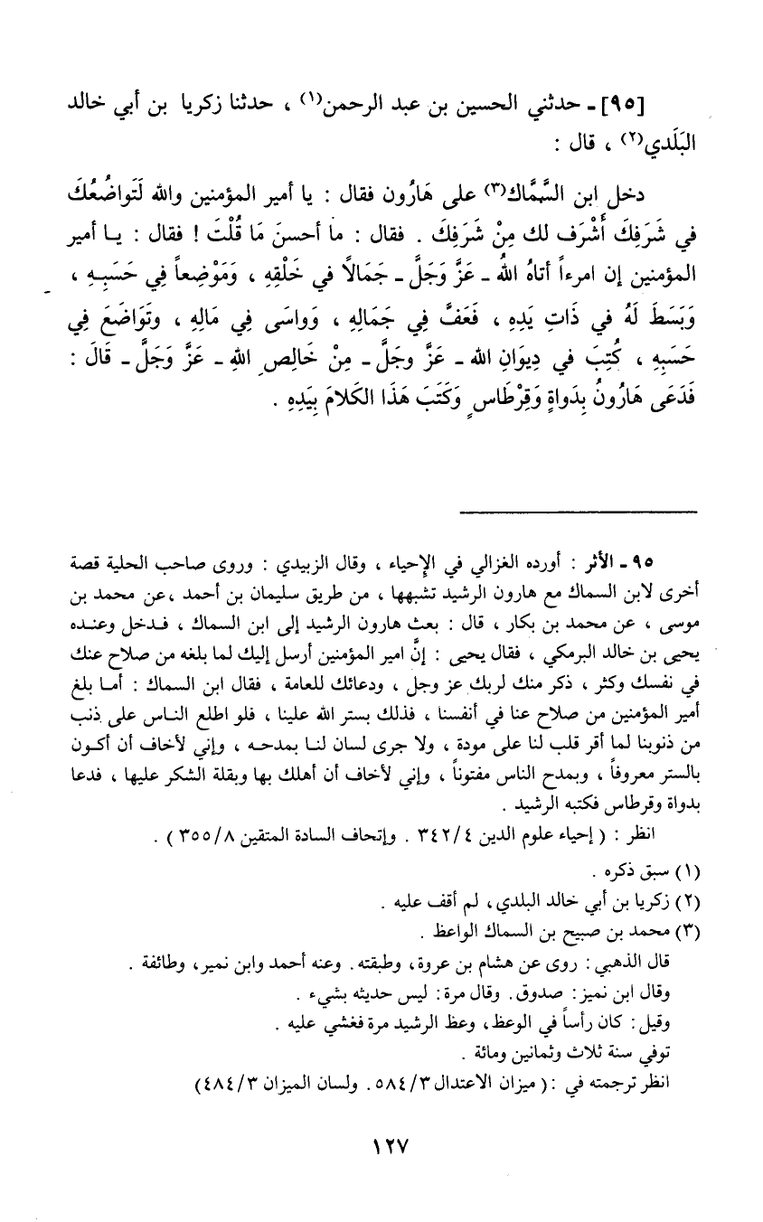95 - حَدَّثَنِي الْحُسَيْنُ بْنُ عَبْدِ الرَّحْمَنِ، حَدَّثَنَا زَكَرِيَّا بْنُ أَبِي خَالِدٍ الْبَلَدِيُّ قَالَ: دَخَلَ ابْنُ السَّمَّاكِ عَلَى هَارُونَ فَقَالَ: " يَا أَمِيرَ الْمُؤْمِنِينَ، §وَاللَّهِ لَتَوَاضُعُكَ فِي شَرَفِكَ أَشْرَفُ لَكَ مِنْ شَرَفِكَ، فَقَالَ: مَا أَحْسَنَ مَا قُلْتَ، فَقَالَ: يَا أَمِيرَ الْمُؤْمِنِينَ، إِنَّ امْرَءًا أَتَاهُ اللَّهُ عَزَّ وَجَلَّ جَمَالًا فِي خَلْقِهِ، وَمَوْضِعًا فِي حَسَبِهِ، وَبَسَطَ لَهُ فِي ذَاتِ يَدِهِ فَعَفَّ فِي جَمَالِهِ، وَوَاسَى فِي مَالِهِ، وَتَوَاضَعَ فِي حَسَبِهِ كُتِبَ فِي دِيوَانِ اللَّهِ عَزَّ وَجَلَّ مِنْ خَالِصِ اللَّهِ عَزَّ وَجَلَّ قَالَ: فَدَعَى هَارُونُ بِدَوَاةٍ وَقِرْطَاسٍ وَكَتَبَ هَذَا الْكَلَامَ بِيَدِهِ "