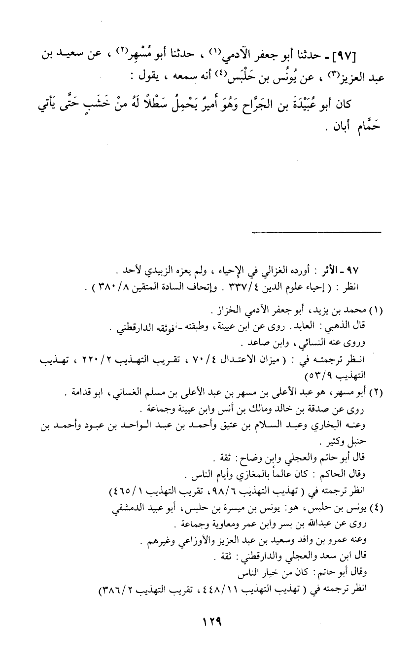 97 - حَدَّثَنَا أَبُو جَعْفَرٍ الْآدَمِيُّ، حَدَّثَنَا أَبُو مُسْهِرٍ، عَنْ سَعِيدِ بْنِ عَبْدِ الْعَزِيزِ، عَنْ يُونُسَ بْنِ حَلْبَسٍ أَنَّهُ سَمِعَهُ يَقُولُ: كَانَ أَبُو عُبَيْدَةَ بْنُ الْجَرَّاحِ وَهُوَ أَمِيرٌ «§يَحْمِلُ سَطْلًا لَهُ مِنْ خَشَبٍ حَتَّى يَأْتِيَ حَمَّامَ أَبَانَ»