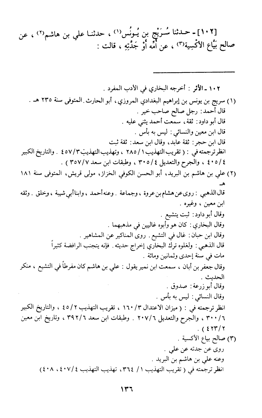 102 - حَدَّثَنَا سُرَيْجُ بْنُ يُونُسَ، حَدَّثَنَا عَلِيُّ بْنُ هَاشِمٍ، عَنْ صَالِحٍ بَيَّاعِ الْأَكْسِيَةِ عَنْ أُمِّهِ، أَوْ جَدَّتِهِ قَالَتْ: رَأَيْتُ عَلِيًّا اشْتَرَى تَمْرًا بِدِرْهَمٍ فَحَمَلَهُ فِي مِلْحَفَتِهِ فَقُلْتُ: أَحْمِلُ عَنْكَ يَا أَمِيرَ الْمُؤْمِنِينَ قَالَ: «لَا §أَبُو الْعِيَالِ أَحَقُّ أَنْ يَحْمِلَ»