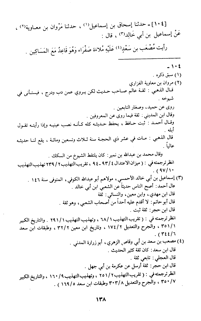 104 - حَدَّثَنَا إِسْحَاقُ بْنُ إِسْمَاعِيلَ، حَدَّثَنَا مَرْوَانُ بْنُ مُعَاوِيَةَ، عَنْ إِسْمَاعِيلَ بْنِ أَبِي خَالِدٍ، قَالَ: «§رَأَيْتُ مُصْعَبَ بْنَ سَعْدٍ عَلَيْهِ مُلَاءَةٌ صَفْرَاءُ وَهُوَ قَاعِدٌ مَعَ الْمَسَاكِينِ»