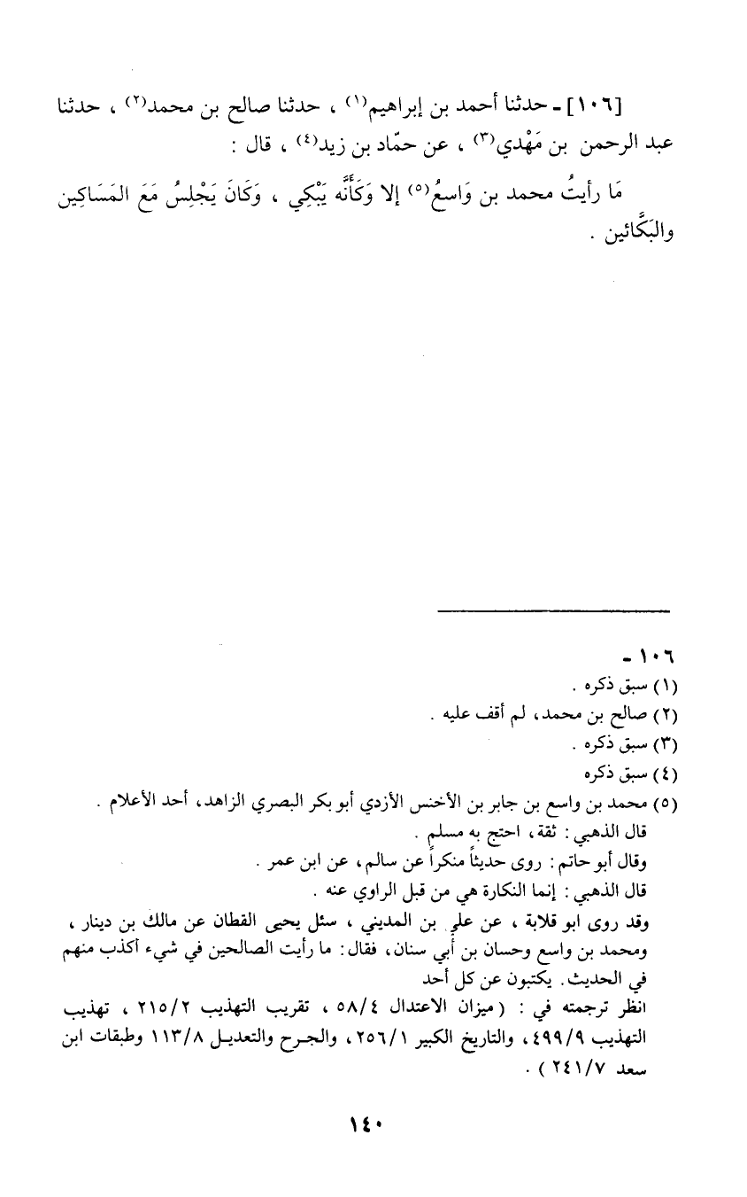 106 - حَدَّثَنَا أَحْمَدُ بْنُ إِبْرَاهِيمَ، حَدَّثَنَا صَالِحُ بْنُ مُحَمَّدٍ، حَدَّثَنَا عَبْدُ الرَّحْمَنِ بْنُ مَهْدِيٍّ، عَنْ حَمَّادِ بْنِ زَيْدٍ، قَالَ: «§مَا رَأَيْتُ مُحَمَّدَ بْنَ وَاسِعٍ إِلَّا وَكَأَنَّهُ يَبْكِي، وَكَانَ يَجْلِسُ مَعَ الْمَسَاكِينِ وَالْبَكَّائِينَ»