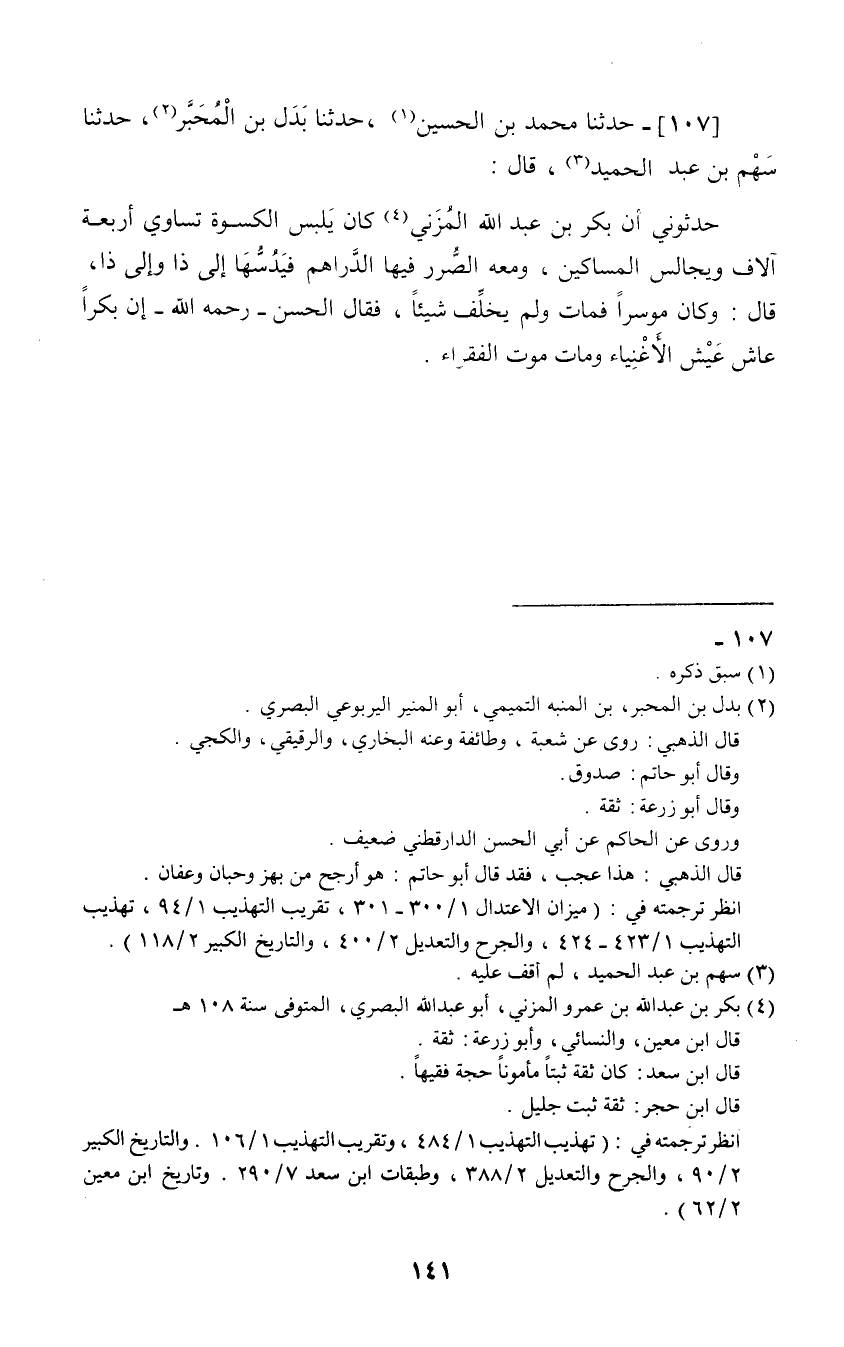 107 - حَدَّثَنَا مُحَمَّدُ بْنُ الْحُسَيْنِ، حَدَّثَنَا بَدَلُ بْنُ الْمُحَبَّرِ، حَدَّثَنَا سَهْمُ بْنُ عَبْدِ الْحَمِيدِ قَالَ: حَدَّثُونِي أَنَّ بَكْرَ بْنَ عَبْدِ اللَّهِ الْمُزَنِيَّ كَانَ يَلْبَسُ الْكِسْوَةَ تُسَاوِي أَرْبَعَةَ آلَافٍ وَيُجَالِسُ الْمَسَاكِينَ وَمَعَهُ الصُّرَرُ فِيهَا الدَّرَاهِمُ فَيَدُسُّهَا إِلَى ذَا وَإِلَى ذَا قَالَ: وَكَانَ مُوسِرًا فَمَاتَ وَلَمْ يُخَلِّفْ شَيْئًا فَقَالَ الْحَسَنُ رَحِمَهُ اللَّهُ: «إِنَّ §بَكْرًا عَاشَ عَيْشَ الْأَغْنِيَاءِ، وَمَاتَ مَوْتَ الْفُقَرَاءِ»