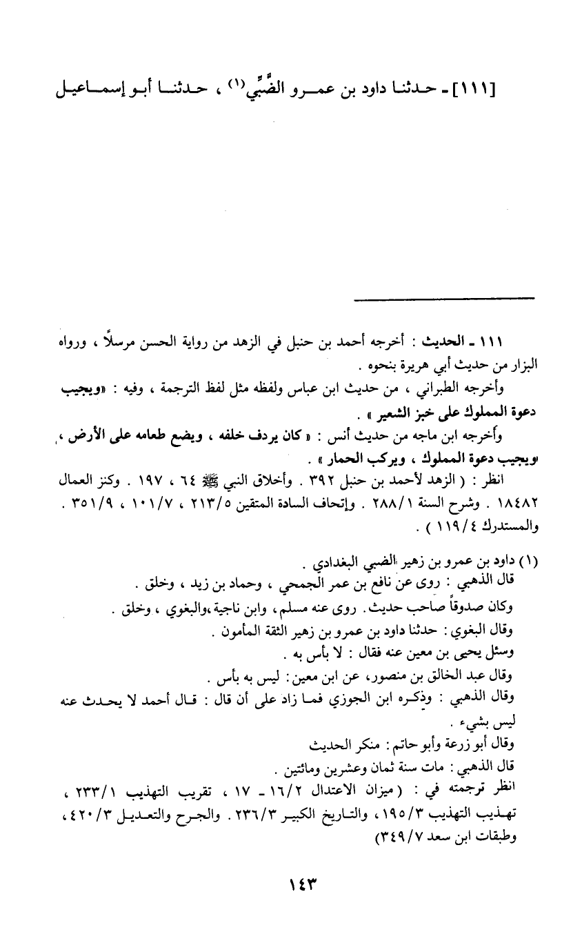 111 - حَدَّثَنَا دَاوُدُ بْنُ عَمْرٍو الضَّبِّيُّ، حَدَّثَنَا أَبُو إِسْمَاعِيلَ -[144]- الْمُؤَدِّبُ، عَنْ مُسْلِمٍ الْأَعْوَرِ، عَنْ سَعِيدِ بْنِ جُبَيْرٍ، عَنِ ابْنِ عَبَّاسٍ قَالَ: «كَانَ §رَسُولُ اللَّهِ صَلَّى اللهُ عَلَيْهِ وَسَلَّمَ يَجْلِسُ عَلَى الْأَرْضِ، وَيَأْكُلُ عَلَى الْأَرْضِ، وَيَعْتَقِلُ النَّاقَةَ، وَيُجِيبُ دَعْوَةَ الْمَمْلُوكِ»